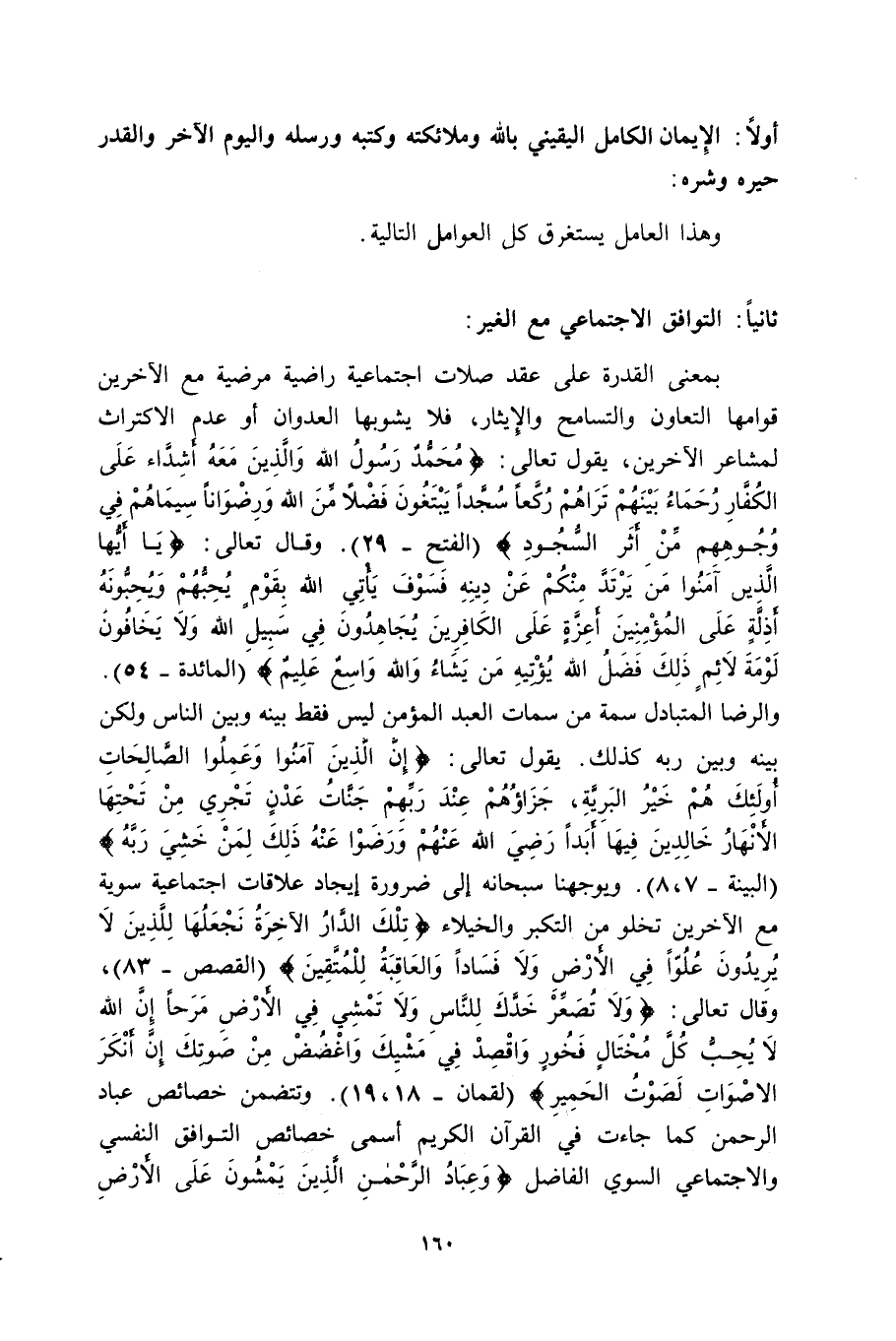 [الفتح: 29] وقال تعالى: {يَا أَيُّهَا الَّذِينَ آمَنُوا مَنْ يَرْتَدَّ مِنْكُمْ عَنْ دِينِهِ فَسَوْفَ يَأْتِي اللَّهُ بِقَوْمٍ يُحِبُّهُمْ وَيُحِبُّونَهُ أَذِلَّةٍ عَلَى الْمُؤْمِنِينَ أَعِزَّةٍ عَلَى الْكَافِرِينَ يُجَاهِدُونَ فِي سَبِيلِ اللَّهِ وَلا يَخَافُونَ لَوْمَةَ لائِمٍ ذَلِكَ فَضْلُ اللَّهِ يُؤْتِيهِ مَنْ يَشَاءُ وَاللَّهُ وَاسِعٌ عَلِيمٌ} [المائدة: 54] والرضا المتبادل سمة من سمات العبد المؤمن ليس فقط بينه وبين الناس ولكن بينه وبين ربه كذلك. يقول تعالى: {إِنَّ الَّذِينَ آمَنُوا وَعَمِلُوا الصَّالِحَاتِ أُوْلَئِكَ هُمْ خَيْرُ الْبَرِيَّةِ، جَزَاؤُهُمْ عِنْدَ رَبِّهِمْ جَنَّاتُ عَدْنٍ تَجْرِي مِنْ تَحْتِهَا الأَنْهَارُ خَالِدِينَ فِيهَا أَبَداً رَضِيَ اللَّهُ عَنْهُمْ وَرَضُوا عَنْهُ ذَلِكَ لِمَنْ خَشِيَ رَبَّهُ} [البينة: 7-8] ، ويوجهنا سبحانه إلى ضرورة إيجاد علاقات اجتماعية سوية مع الآخرين تخلو من التكبر والخيلاء: {تِلْكَ الدَّارُ الآخِرَةُ نَجْعَلُهَا لِلَّذِينَ لا يُرِيدُونَ عُلُوّاً فِي الأَرْضِ وَلا فَسَاداً وَالْعَاقِبَةُ لِلْمُتَّقِينَ} [القصص: 83] وقال تعالى: {وَلا تُصَعِّرْ خَدَّكَ لِلنَّاسِ وَلا تَمْشِ فِي الأَرْضِ مَرَحاً إِنَّ اللَّهَ لا يُحِبُّ كُلَّ مُخْتَالٍ فَخُورٍ، وَاقْصِدْ فِي مَشْيِكَ وَاغْضُضْ مِنْ صَوْتِكَ إِنَّ أَنكَرَ الأَصْوَاتِ لَصَوْتُ الْحَمِيرِ} [لقمان: 18-19] ، وتتضمن خصائص عباد الرحمن كما جاءت في القرآن الكريم أسمى خصائص التوافق النفسي والاجتماعي السوي الفاضل: {وَعِبَادُ الرَّحْمَنِ الَّذِينَ يَمْشُونَ عَلَى الأَرْضِ