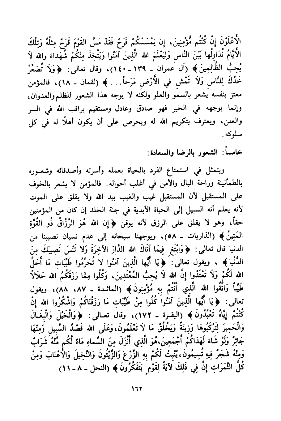 الأَعْلَوْنَ إِنْ كُنْتُمْ مُؤْمِنِينَ، إِنْ يَمْسَسْكُمْ قَرْحٌ فَقَدْ مَسَّ الْقَوْمَ قَرْحٌ مِثْلُهُ وَتِلْكَ الأَيَّامُ نُدَاوِلُهَا بَيْنَ النَّاسِ وَلِيَعْلَمَ اللَّهُ الَّذِينَ آمَنُوا وَيَتَّخِذَ مِنْكُمْ شُهَدَاءَ وَاللَّهُ لا يُحِبُّ الظَّالِمِينَ} [آل عمران: 139-140] ، وقال تعالى: {وَلا تُصَعِّرْ خَدَّكَ لِلنَّاسِ وَلا تَمْشِ فِي الأَرْضِ مَرَحا} [لقمان: 18] ، فالمؤمن معتز بنفسه يشعر بالسمو والعلو ولكنه لا يوجه هذا الشعور للظلم والعدوان، وإنما يوجهه في الخير فهو صادق وعادل ومستقيم يراقب الله في السر والعلن، ويعترف بتكريم الله له ويحرص على أن يكون أهلًا له في كل سلوكه.