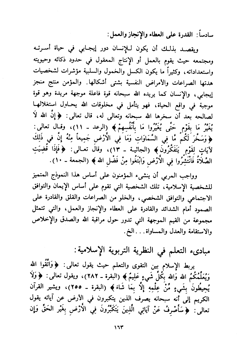 وواجب المربي أن ينشئ المؤمنينَ على أساس هذا النموذج المتميز للشخصية الإسلامية، تلك الشخصية التي تقوم على أساس الإيمان والتوافق الاجتماعي والتوافق الشخصي، والخلو من الصراعات والقلق والقادرة على الصمود أمام الشدائد والقادرة على العطاء والإنجاز والعمل، والتي تتمثل مجموعة من القيم الموجهة التي تدور حول مراقبة الله والصدق والإخلاص والاستقامة والعدل والمساواة ... إلخ.