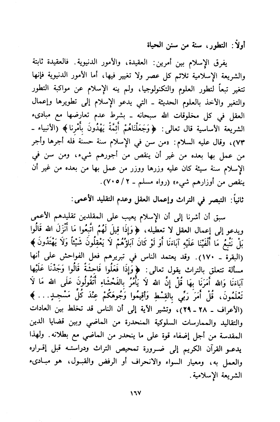 سَبَقَ أَنْ أَشَرْنَا إِلَى أَنَّ الإسلام يعيب على المقلدين تقليدهم الأعمى ويدعو إلى إعمال العقل لا تعطيله، {وَإِذَا قِيلَ لَهُمُ اتَّبِعُوا مَا أَنزَلَ اللَّهُ قَالُوا بَلْ نَتَّبِعُ مَا أَلْفَيْنَا عَلَيْهِ آبَاءَنَا أَوَلَوْ كَانَ آبَاؤُهُمْ لا يَعْقِلُونَ شَيْئًا وَلا يَهْتَدُونَ} [البقرة: 170] . وقد يعتمد الناس في تبريرهم فعل الفواحش على أنها مسألة تتعلق بالتراث يقول تعالى: {وَإِذَا فَعَلُوا فَاحِشَةً قَالُوا وَجَدْنَا عَلَيْهَا آبَاءَنَا وَاللَّهُ أَمَرَنَا بِهَا قُلْ إِنَّ اللَّهَ لا يَأْمُرُ بِالْفَحْشَاءِ أَتَقُولُونَ عَلَى اللَّهِ مَا لا تَعْلَمُونَ، قُلْ أَمَرَ رَبِّي بِالْقِسْطِ وَأَقِيمُوا وُجُوهَكُمْ عِنْدَ كُلِّ مَسْجِدٍ} [الأعراف: 28-29] ، وتشير الآية إلى أن الناس قد تخلط بين العادات والتقاليد والممارسات السلوكية المنحدرة من الماضي وبين قضايا الدين المقدسة من أجل إضفاء قوة على ما ينحدر من الماضي وبين قضايا الدين المقدسة من أجل إضفاء قوة على ما ينحدر من الماضي مع بطلانه. ولهذا يدعو القرآن الكريم إلى ضرورة تمحيص التراث ودراسته قبل إقراره والعمل به، ومعيار السواء والانحراف أو الرفض والقبول، وهو مبادئ الشريعة الإسلامية.