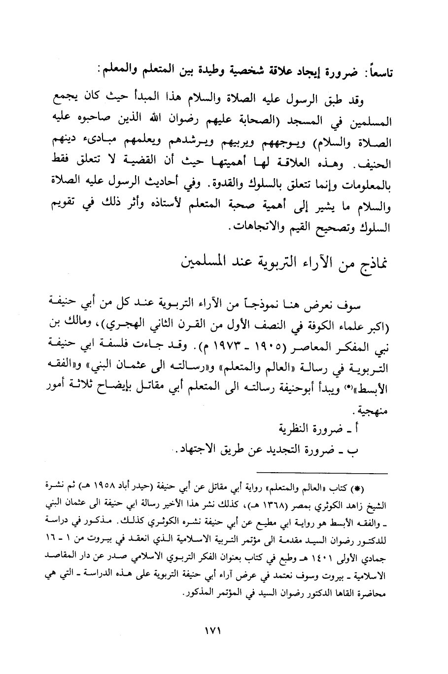 سوف نعرض هنا نموذجا من الآراء التربوية عند كل من أبي حنيفة أكبر علماء الكوفة في النصف الأول من القرن الثاني الهجري، ومالك بن نبي المفكر المعاصر 1905-1973م. وقد جاءت فلسفة أبي حنيفة التربوية في رسالة العالم والمتعلم ورسالته إلى عثمان البني والفقه الأبسط* ويبدأ أبو حنيفة إلى المتعلم أبي مقاتل بإيضاح ثلاثة أمور منهجية: