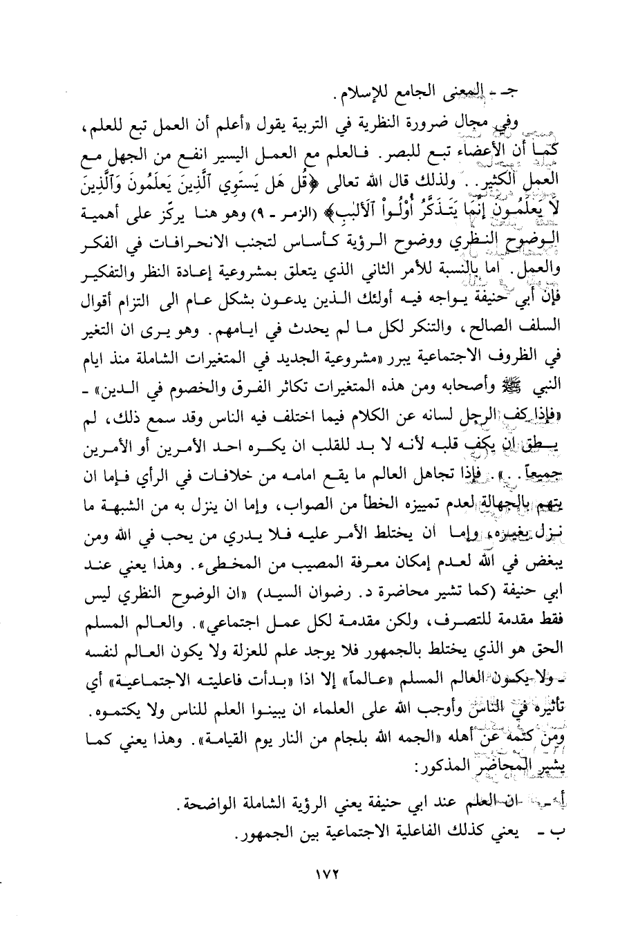 وفي مجال ضرورة النظرية في التربية يقول أعلم أن العمل تبع للعلم، كما أن الأعضاء تبع للبصر. فالعلم مع العمل اليسير أنفع من الجهل مع العمل الكثير. ولذلك قال الله تعالى: {قُلْ هَلْ يَسْتَوِي الَّذِينَ يَعْلَمُونَ وَالَّذِينَ لا يَعْلَمُونَ إِنَّمَا يَتَذَكَّرُ أُوْلُوا الأَلْبَابِ} [الزمر: 9] وهو هنا يركز على أهمية الوضوح النظري ووضوح الرؤية كأساس لتجنب الانحرافات في الفكر والعمل. أما بالنسبة للأمر الثاني الذي يتعلق بمشروعية إعادة النظر والتفكير فإن أبي حنيفة يواجه فيه أولئك الذين يدعون بشكل عام إلى التزام أقوال السلف الصالح، والتنكر لكل ما لم يحدث في أيامهم. وهو يرى أن التغير في الظروف الاجتماعية يبرر مشروعية الجديد في المتغيرات الشاملة منذ أيام النبي -صلى الله عليه وسلم- وأصحابه ومن هذه المتغيرات تكاثر الفرق والخصوم في الدين فإذا كف الرجل لسانه عن الكلام فيما اختلف فيه الناس وقد سمع ذلك، لم يطلق أن يكف قلبه لأنه لا بد للقلب أن يكره أحد الأمرين أو الأمرين جميعًا. فإذا تجاهل العلم ما يقع أمامه من خلافات في الرأي فإما أن يهتم بالجهالة لعدم تمييزه الخطأ من الصواب، وإما أن ينزل به من الشبهة ما نزل بغيره، وإما أن يختلط الأمر عليه فلا يدري من يحب في الله ومن يبغض في الله لعدم إمكان معرفة المصيب من المخطئ. وهذا يعنى عند أبي حنيفة كما تشير محاضرة د. رضوان السيد أن الوضوح النظري ليس فقط مقدمة للتصرف، ولكن مقدمة لكل عمل اجتماعي. والعالم المسلم الحق هو الذى يختلط بالجمهور فلا يوجد علم للعزلة ولا يكون العالم لنفسه ولا يكون العالم المسلم عالمًا إلا إذا بدأت فاعليته الاجتماعية أي تأثيره في الناس وأوجب الله على العلماء أن يبينوا العلم للناس ولا يكتموه. ومن كتمه عن أهله ألجمه الله بلجام من النار يوم القيام. وهذا يعني كما يشير المحاضر المذكور:
