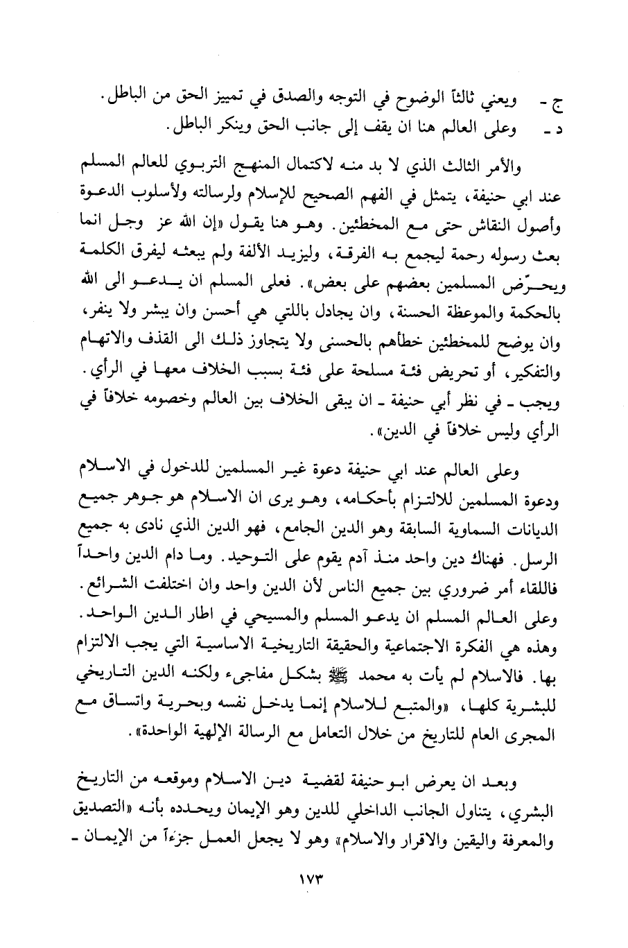 وعلى العالم -عند أبي حنيفة- دعوة غير المسلمين للدخول في الإسلام ودعوة المسلمين للالتزام بأحكامه، وهو يرى أن الإسلام هو جوهر جميع الديانات السماوية السابقة وهو الدين الجامع، فهو الدين الذي نادى به جميع الرسل. فهناك دين واحد منذ زمن آدم يقوم على التوحيد. وما دام الدين واحدا فاللقاء أمر ضروري بين جميع الناس لأن الدين واحد وإن اختلفت الشرائع. وعلى العالم المسلم أن يدعو المسلم والمسيحي في إطار الدين الواحد. وهذه هي الفكرة الاجتماعية والحقيقة التاريخية الأساسية التي يجب الالتزام بها. بالإسلام لم يأت به محمد -صلي الله عليه وسلم- بشكل مفاجئ ولكنه الدين التاريخي للبشرية كلها، والمتبع للإسلام إنما يدخل نفسه وبحرية واتساق مع المجرى العام للتاريخ من خلال التعامل مع الرسالة الإلهية الواحدة.