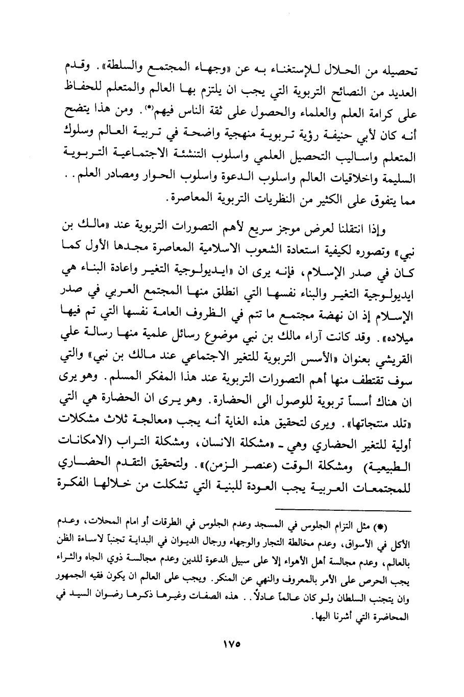 وإذا انتقلنا لعرض موجز سريع لأهم التصورات التربوية عند مالك بن نبي وتصوره لكيفية استعادة الشعوب الإسلامية المعاصرة مجدها الأول كما كان في صدر الإسلام، فإنه يرى أن إيديولوجية التغير وإعادة البناء هي إيديولوجية التغير والبناء نفسها التي انطلق منها المجتمع العربي في صدر الإسلام إذ إن نهضة مجتمع ما تتم في الظروف العامة نفسها التي تم فيها ميلاده. وقد كانت آراء مالك بن نبي موضوع رسائل علمية منها رسالة علي القريشي بعنوان الأسس التربوية للتغير الاجتماعي عند مالك بن نبي والتي سوف تقتطف منها أهم التصورات التربوية عند هذا المفكر المسلم. وهو يرى أن هناك أسسا تربوية للوصول إلى الحضارة. وهو يرى أن الحضارة هي التي تلد منتجاتها. ويرى لتحقيق هذه الغاية أنه يجب معالجة ثلاث مشكلات أولية للتغير الحضاري وهي: مشكلة الإنسان، ومشكلة التراب "الإمكانات الطبيعية" ومشكلة الوقت "عنصر الزمن". ولتحقيق التقدم الحضاري للمجتمعات العربية يجب العودة للبنية التي شكلت من خلالها الفكرة