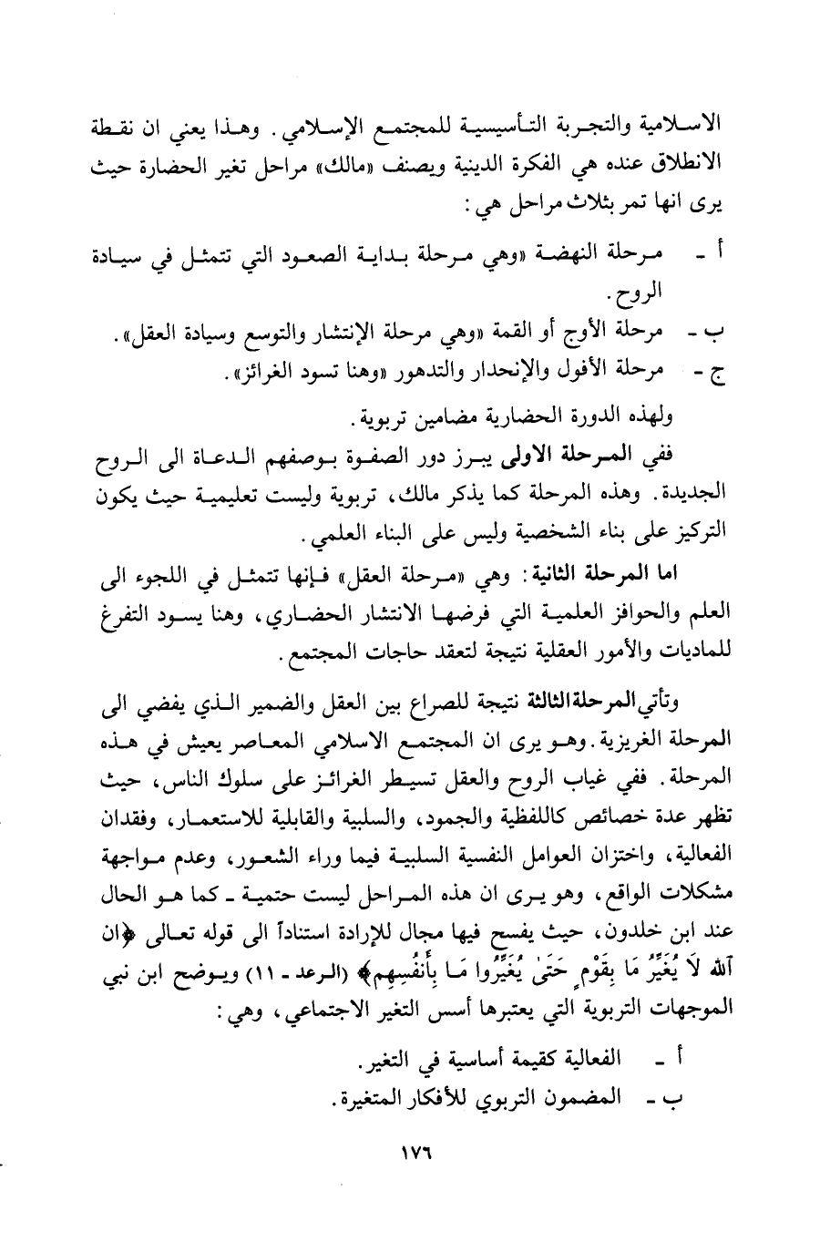 الإسلامية والتجربة التأسيسية للمجتمع الإسلامي. وهذا يعني أن نقطة الانطلاق عنده هي الفكرة الدينية ويصنف مالك مراحل تغير الحضارة حيث يرى أنها تمر بثلاث مراحل هي: