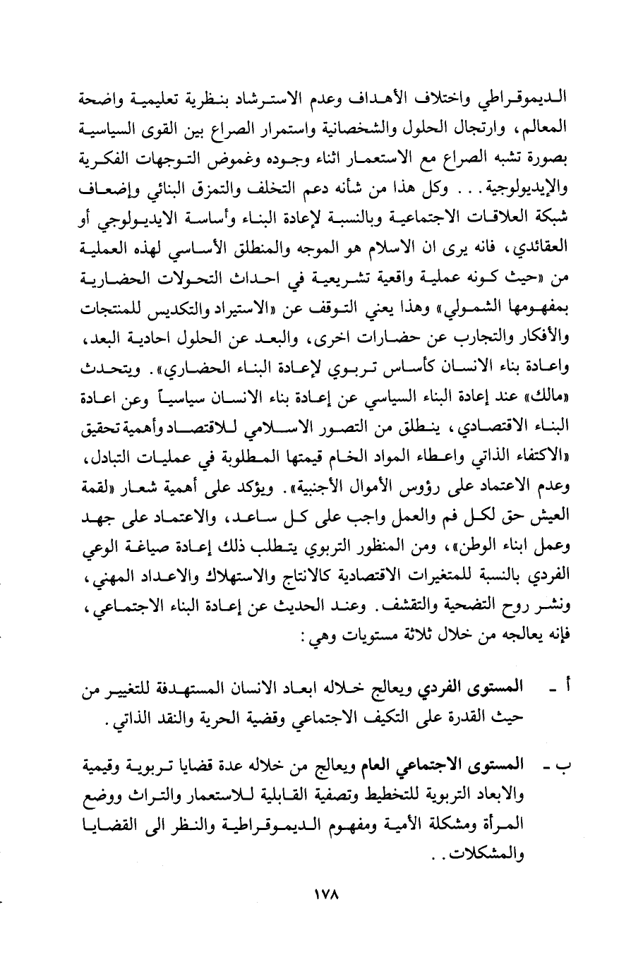 ويعالج من خلاله عدة قضايا تربوية وقيمية والأبعاد التربوية للتخطيط وتصفية القابلية للاستعمار والتراث ووضع المرأة ومشكلة الأمية ومفهوم الديمقراطية والنظر إلى القضايا والمشكلات.
