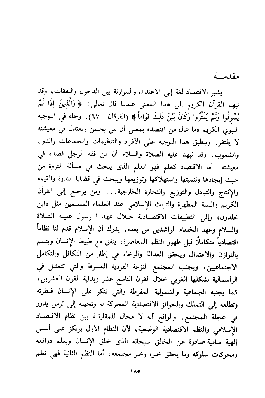 يشير الاقتصاد لغة إلى الاعتدال والموازنة بين الدخول والنفقات، وقد نبهنا القرآن الكريم إلى هذا المعنى عندما قال تعالى: {وَالَّذِينَ إِذَا أَنفَقُوا لَمْ يُسْرِفُوا وَلَمْ يَقْتُرُوا وَكَانَ بَيْنَ ذَلِكَ قَوَاماً} [الفرقان: 67] ، وجاء في التوجيه النبوي الكريم: "ما عال من اقتصد" بمعنى أن من يحسن ويعتدل في معيشته لا يفتقر. وينطبق هذا التوجيه على الأفراد والتنظيمات والجماعات والدول والشعوب. وقد نبهنا عليه الصلاة والسلام أن من فقه الرجل قصده في معيشته. أما الاقتصاد كعلم فهو العلم الذي يبحث في مسألة الثروة من حيث إيجادها وتنميتها واستهلاكها وتوزيعها ويبحث في قضايا الندرة والقيمة والإنتاج والتبادل والتوزيع والتجارة الخارجية ... ومن يرجع إلى القرآن الكريم والسنة المطهرة والتراث الإسلامي عند العلماء المسلمين مثل ابن خلدون وإلى التطبيقات الاقتصادية خلال عهد الرسول -عليه الصلاة والسلام- وعهد الخلفاء الراشدين من بعده، يدرك أن الإسلام قدم لنا نظاما اقتصاديا متكاملا قبل ظهور العدالة والرخاء في إطار من التكافل والتكامل الاجتماعيين، ويجنب المجتمع النزعة الفردية المسرفة والتي تتمثل في الرأسمالية بشكلها الغربي خلال القرن التاسع عشر وبداية القرن العشرين، كما يجنبه الجماعة والشمولية المفرطة والتي تنكر على الإنسان فطرته وتطلعه إلى التملك والحوافز الاقتصادية المحركة له وتحيله إلى ترس يدور في عجلة المجتمع. والواقع أنه لا مجال للمقارنة بين نظام الاقتصاد الإسلامي والنظم الاقتصادية الوضعية؛ لأن النظام الأول يرتكز على أسس إلهية سامية صادرة عن الخالق سبحانه الذي خلق الإنسان ويعلم دوافعه ومحركات سلوكه وما يحقق خيره وخير مجتمعه، أما النظم الثانية فهي نظم