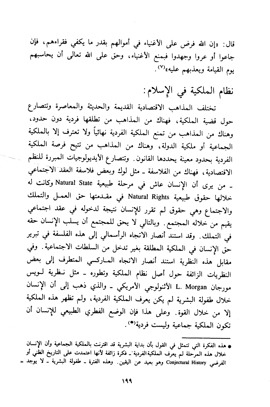 *هذه الفكرة التي تتمثل في القول بداية البشرية قد اقترنت بالملكية الجماعية وأن الإنسان خلال هذه المرحلة لم يعرف الملكية الفردية -فكرة زائفة لأنها اعتمدت على التاريخ الظني أو الفرضي Conjectural History وهو بعيد عن اليقين. وهذه الفترة -طفولة البشرية- لا يوجد لدينا شيء يقيني عنها. وإذا رجعنا إلى التاريخ الاجتماعي للشعوب القديمة التي توجد لدينا بيانات عنها مثل مصر الفرعونية والإغريق والرومان القدماء وبني إسرائيل، نجد أن هذه الشعوب جميعها عرفت أشكال الملكية الخاصة. وفي المصادر الإسلامية اليقينية ما يدل على أن الملكية الفردية ظاهرة ارتبطت بوجود الإنسان. يضاف إلى هذا أن الدراسات النفسية والاجتماعية الصادقة تشير إلى أن النزعة إلى التملك نزعة فطرية، وأن الإنسان البدائي -مهما أوغل في البدائية- يعرف شكلا من الخاصة، على الأقل ملكية ملابسه وأسلحته ومنقولاته ... إلخ.
