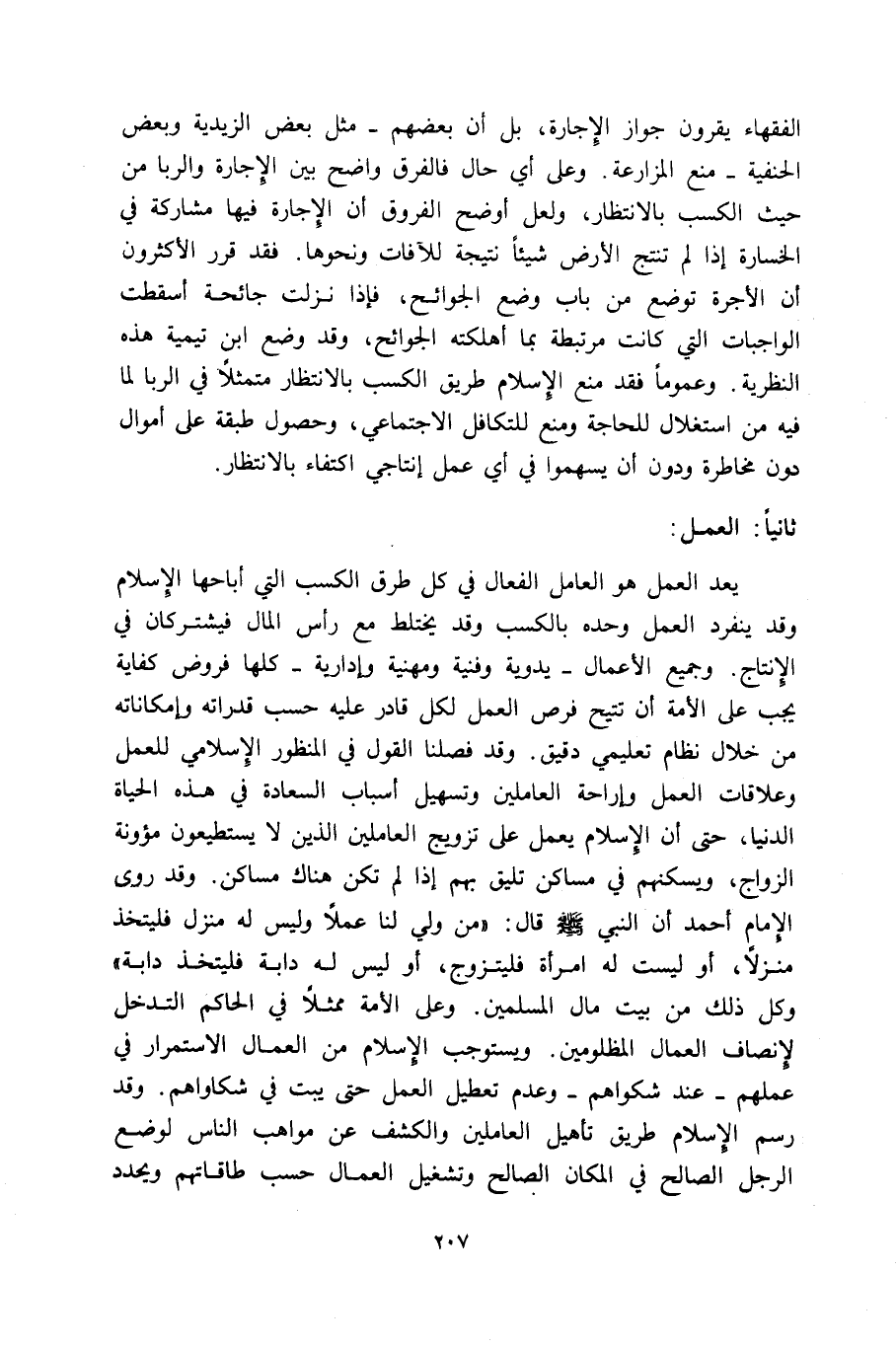 يعد العمل هو العامل الفعال في كل طرق الكسب التي أباحها الإسلام وقد ينفرد العمل وحده بالكسب وقد يختلط مع رأس المال فيشتركان في الإنتاج. وجميع الأعمال -يدوية وفنية ومهنية وإدارية- كلها فروض كفاية يجب على الأمة أن تتيح فرص العمل لكل قادر عليه حسب قدراته وإمكاناته من خلال نظام تعليمي دقيق. وقد فصلنا القول في المنظور الإسلامي للعمل وعلاقات العمل وإراحة العاملين وتسهيل أسباب السعادة في هذه الحياة الدنيا، حتى إن الإسلام يعمل على تزويج العاملين الذين لا يستطيعون مئونة الزواج، ويسكنهم في مساكن تليق بهم إذا لم تكن هناك مساكن. قد روى الإمام أحمد عن النبي -صلي الله عليه وسلم- قال: "من ولي لنا عملا وليس له منزل فليتخذ منزلا، أو ليست له امرأة فليتزوج، أو ليس له دابة فليتخذ دابة". وكل ذلك من بين مال المسلمين. وعلى الأمة ممثلا في الحاكم التدخل لإنصاف العمال المظلومين. ويستوجب الإسلام من العمال الاستمرار في عملهم -عند شكواهم- وعدم تعطيل العمل حتى يبت في شكواهم. وقد رسم الإسلام طريق تأهيل العاملين والكشف عن مواهب الناس لوضع الرجل الصالح في المكان الصالح وتشغيل العمال حسب طاقاتهم ويحدد