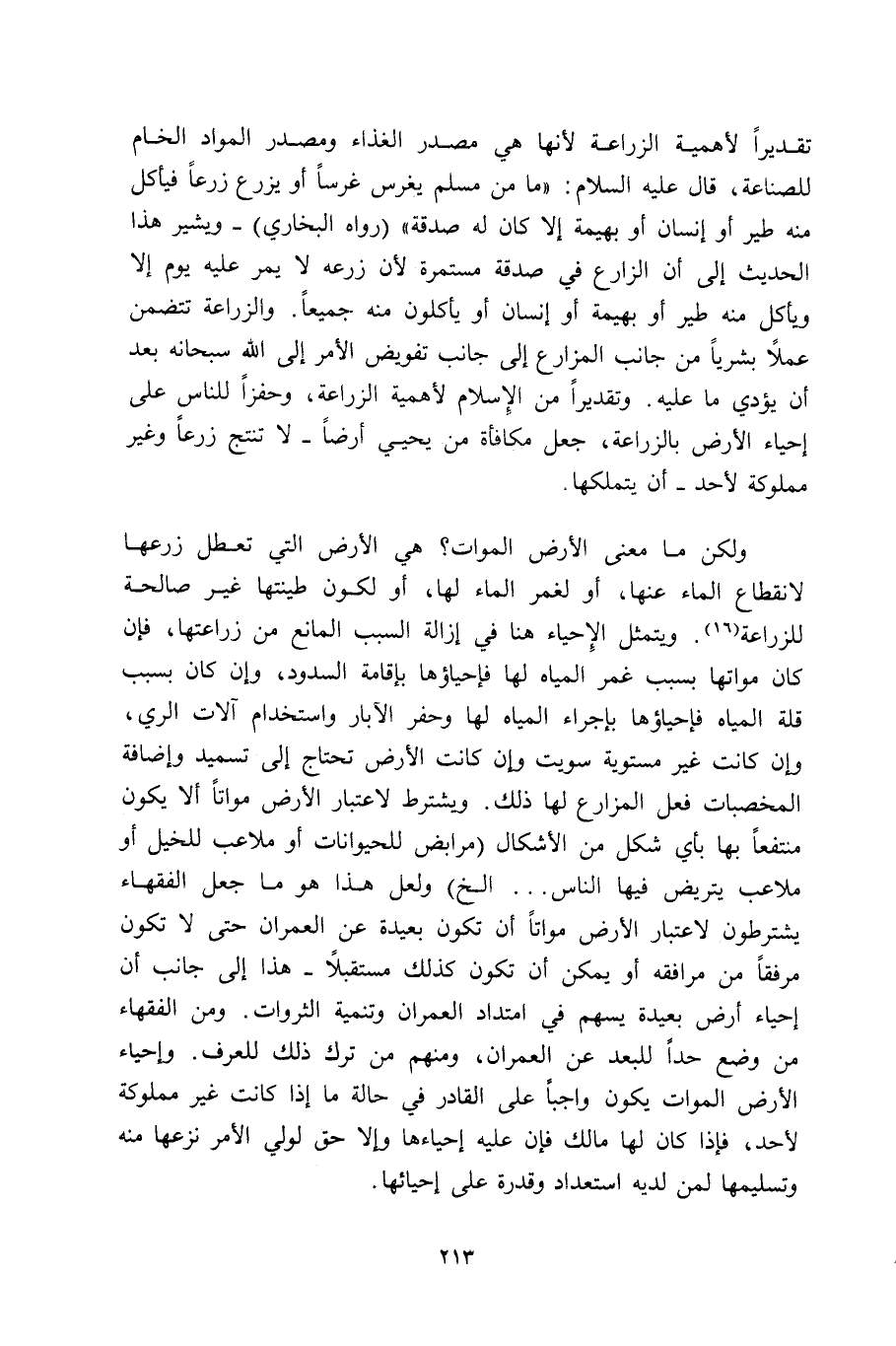 ولكن ما معنى الأرض الموات؟ هي الأرض التي تعطل زرعها لانقطاع الماء عنها، أو لغمر الماء لها، أو لكون طينتها غير صالحة للزراعة16. ويتمثل الإحياء هنا في إزالة السبب المانع من زراعتها، فإن كان مواتها بسبب غمر المياه لها فإحياؤها بإقامة السدود، وإن كان بسبب قلة المياه فإحياؤها بإجراء المياه لها وحفر الآبار واستخدام آلات الري، وإن كانت غير مستوية سويت وإن كانت الأرض تحتاج إلى تسميد وإضافة المخصبات فعلى المزارع لها ذلك. ويشترط لاعتبار الأرض مواتًا ألا يكون منتفعًا بها بأي شكل من الأشكال -مرابض للحيوانات أو ملاعب للخيل يتريض فيها الناس ... إلخ ولعل هذا هو ما جعل الفقهاء يشترطون لاعتبار الأرض مواتًا أن تكون بعيدة عن العمران حتى لا تكون مرفقًا من مرافقه أو يمكن أن تكون كذلك مستقبلًا -هذا إلى جانب أن إحياء أرض بعيدة يسهم في امتداد العمران وتنمية الثروات. ومن الفقهاء من وضع حد للبعد عن العمران، ومنهم من ترك ذلك للعرف. وإحياء الأرض الموات يكون واجبًا على القادر في حالة ما إذا كانت غير مملوكة لأحد، فإذا كان لها مالك فإن عليه إحياءها وإلا حق لولي الأمر نزعها منه وتسليمها لمن لديه استعداد وقدرة على إحيائها.