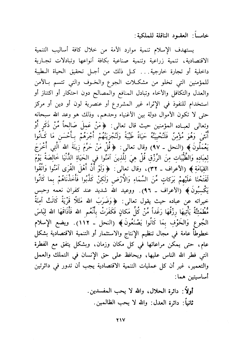 يستهدف الإسلام تنمية موارد الأمة من خلال كافة أساليب التنمية الاقتصادية، تنمية زراعية وتنمية صناعية بكافة أنواعها وتبادلات تجارية داخلية أو تجارة خارجية ... كل ذلك من أجل تحقيق الحياة الطيبة للمؤمنين التي تخلو من مشكلات الجوع والخوف والتي تتسم بالأمن والعدل والتكافل والإخاء وتبادل المنافع والمصالح دون احتكار أو اكتناز أو استخدام للنفوذ في الإثراء غير المشروع أو عنصرية لون أو دين أو مركز حتى لا تكون الأموال دولة بين الأغنياء وحدهم، وذلك وعد الله سبحانه وتعالى لعباده المؤمنين حيث قال تعالى: {مَنْ عَمِلَ صَالِحاً مِنْ ذَكَرٍ أَوْ أُنثَى وَهُوَ مُؤْمِنٌ فَلَنُحْيِيَنَّهُ حَيَاةً طَيِّبَةً وَلَنَجْزِيَنَّهُمْ أَجْرَهُمْ بِأَحْسَنِ مَا كَانُوا يَعْمَلُونَ} [النحل: 97] وقال تعالى: {قُلْ مَنْ حَرَّمَ زِينَةَ اللَّهِ الَّتِي أَخْرَجَ لِعِبَادِهِ وَالطَّيِّبَاتِ مِنَ الرِّزْقِ قُلْ هِيَ لِلَّذِينَ آمَنُوا فِي الْحَيَاةِ الدُّنْيَا خَالِصَةً يَوْمَ الْقِيَامَةِ} [الأعراف: 32] ، وقال تعالى: {وَلَوْ أَنَّ أَهْلَ الْقُرَى آمَنُوا وَاتَّقَوْا لَفَتَحْنَا عَلَيْهِمْ بَرَكَاتٍ مِنَ السَّمَاءِ وَالأَرْضِ وَلَكِنْ كَذَّبُوا فَأَخَذْنَاهُمْ بِمَا كَانُوا يَكْسِبُونَ} [الأعراف: 96] . ووعيد الله شديد عند كفران نعمه وحبس خيراته عن عباده حيث يقول تعالى: {وَضَرَبَ اللَّهُ مَثَلاً قَرْيَةً كَانَتْ آمِنَةً مُطْمَئِنَّةً يَأْتِيهَا رِزْقُهَا رَغَداً مِنْ كُلِّ مَكَانٍ فَكَفَرَتْ بِأَنْعُمِ اللَّهِ فَأَذَاقَهَا اللَّهُ لِبَاسَ الْجُوعِ وَالْخَوْفِ بِمَا كَانُوا يَصْنَعُونَ} [النحل: 112] . ويضع الإسلام خطوطًا عامة في مجال تنظيم الإنتاج والاستثمار أو التنمية الاقتصادية بشكل عام، حتى يمكن مراعاتها في كل مكان وزمان، وبشكل يتفق مع الفطرة التي فطر الله الناس عليها، ويحافظ على حق الإنسان في التملك والعمل والتعمير، غير أن كل عمليات التنمية الاقتصادية يجب أن تدور في دائرتين أساسيتين هما: