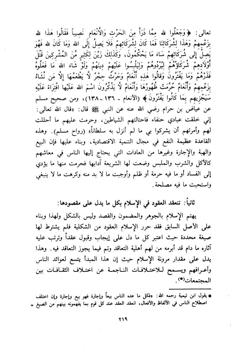 تعالى: {وَجَعَلُوا لِلَّهِ مِمَّا ذَرَأَ مِنَ الْحَرْثِ وَالأَنْعَامِ نَصِيباً فَقَالُوا هَذَا لِلَّهِ بِزَعْمِهِمْ وَهَذَا لِشُرَكَائِنَا فَمَا كَانَ لِشُرَكَائِهِمْ فَلا يَصِلُ إِلَى اللَّهِ وَمَا كَانَ لِلَّهِ فَهُوَ يَصِلُ إِلَى شُرَكَائِهِمْ سَاءَ مَا يَحْكُمُونَ، وَكَذَلِكَ زَيَّنَ لِكَثِيرٍ مِنَ الْمُشْرِكِينَ قَتْلَ أَوْلادِهِمْ شُرَكَاؤُهُمْ لِيُرْدُوهُمْ وَلِيَلْبِسُوا عَلَيْهِمْ دِينَهُمْ وَلَوْ شَاءَ اللَّهُ مَا فَعَلُوهُ فَذَرْهُمْ وَمَا يَفْتَرُونَ، وَقَالُوا هَذِهِ أَنْعَامٌ وَحَرْثٌ حِجْرٌ لا يَطْعَمُهَا إِلاَّ مَنْ نَشَاءُ بِزَعْمِهِمْ وَأَنْعَامٌ حُرِّمَتْ ظُهُورُهَا وَأَنْعَامٌ لا يَذْكُرُونَ اسْمَ اللَّهِ عَلَيْهَا افْتِرَاءً عَلَيْهِ سَيَجْزِيهِمْ بِمَا كَانُوا يَفْتَرُونَ} [الأنعام: 136-138] ، ومن صحيح مسلم عن عياض بن حرام رضي الله عنه عن النبي صلي الله عليه وسلم قال: "قال الله تعالى: إني خلقت عبادي حنفاء فاحتالتهم الشياطين، وحرمت عليهم ما أحللت لهم وأمرتهم أن يشركوا بي ما لم أنزل به سلطانًا". وهذه القاعدة عظيمة النفع في مجال التنمية الاقتصادية، وبناء عليها فإن البيع والهبة والإجارة وغيرها من العادات التي يحتاج إليها الناس في معاشهم كالأكل والشرب والملبس وضعت لها الشريعة آدابها فحرمت منها ما يؤدي إلى الفساد أو ما فيه حرمة أو ظلم وأوجبت ما لا بد منه وكرهت ما لا ينبغي واستحبت ما فيه مصلحة.
