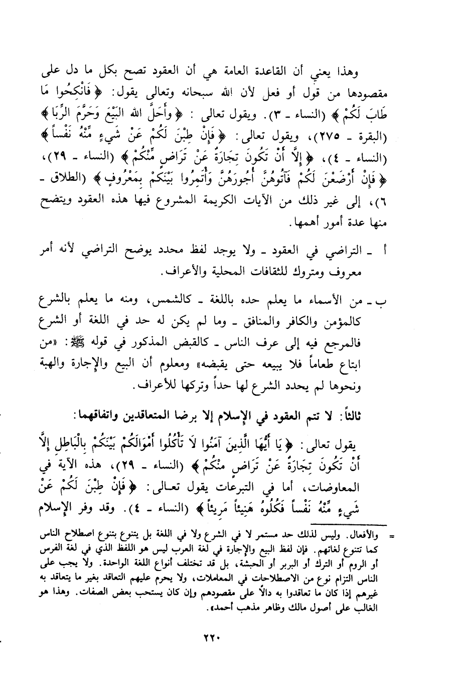 وهذا يعني أن القاعدة العامة هي أن العقود تصح بكل ما دل على مقصودها من قول أو فعل لأن الله سبحانه وتعالى يقول: {فَانكِحُوا مَا طَابَ لَكُم} [النساء: 3] . ويقول تعالى: {وَأَحَلَّ اللَّهُ الْبَيْعَ وَحَرَّمَ الرِّبَا} [البقرة: 275] ، ويقول تعالى: {فَإِنْ طِبْنَ لَكُمْ عَنْ شَيْءٍ مِنْهُ نَفْسًا} [النساء: 4] ، {فَإِنْ أَرْضَعْنَ لَكُمْ فَآتُوهُنَّ أُجُورَهُنَّ وَأْتَمِرُوا بَيْنَكُمْ بِمَعْرُوفٍ} [الطلاق: 6] ، إلى غير ذلك من الآيات الكريمة المشروع فيها هذه العقود ويتضح منها عدة أمور أهمها: