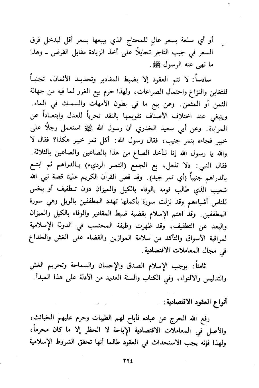 فقال النبي: " لا تفعل، بع الجمع -التمر الرديء- بالدراهم ثم ابتع بالدراهم جنيبًا -أي: تمر جيد-" وقد قص القرآن الكريم علينا قصة نبي الله شعيب الذي طالب قومه بالوفاء بالكيل والميزان دون تطفيف أو بخس للناس أشياءهم وقد نزلت سورة بأكملها تهدد المطففين بالويل وهي سورة المطففين. وقد اهتم الاسلام بقضية ضبط المقادير والوفاء بالكيل والميزان والبعد عن التطفيف، وقد ظهرت وظيفة المحتسب في الدولة الإسلامية لمراقبة الأسواق والتأكد من سلامة الموازين والقضاء على الغش والخداع في مجال المعاملات الاقتصادية.