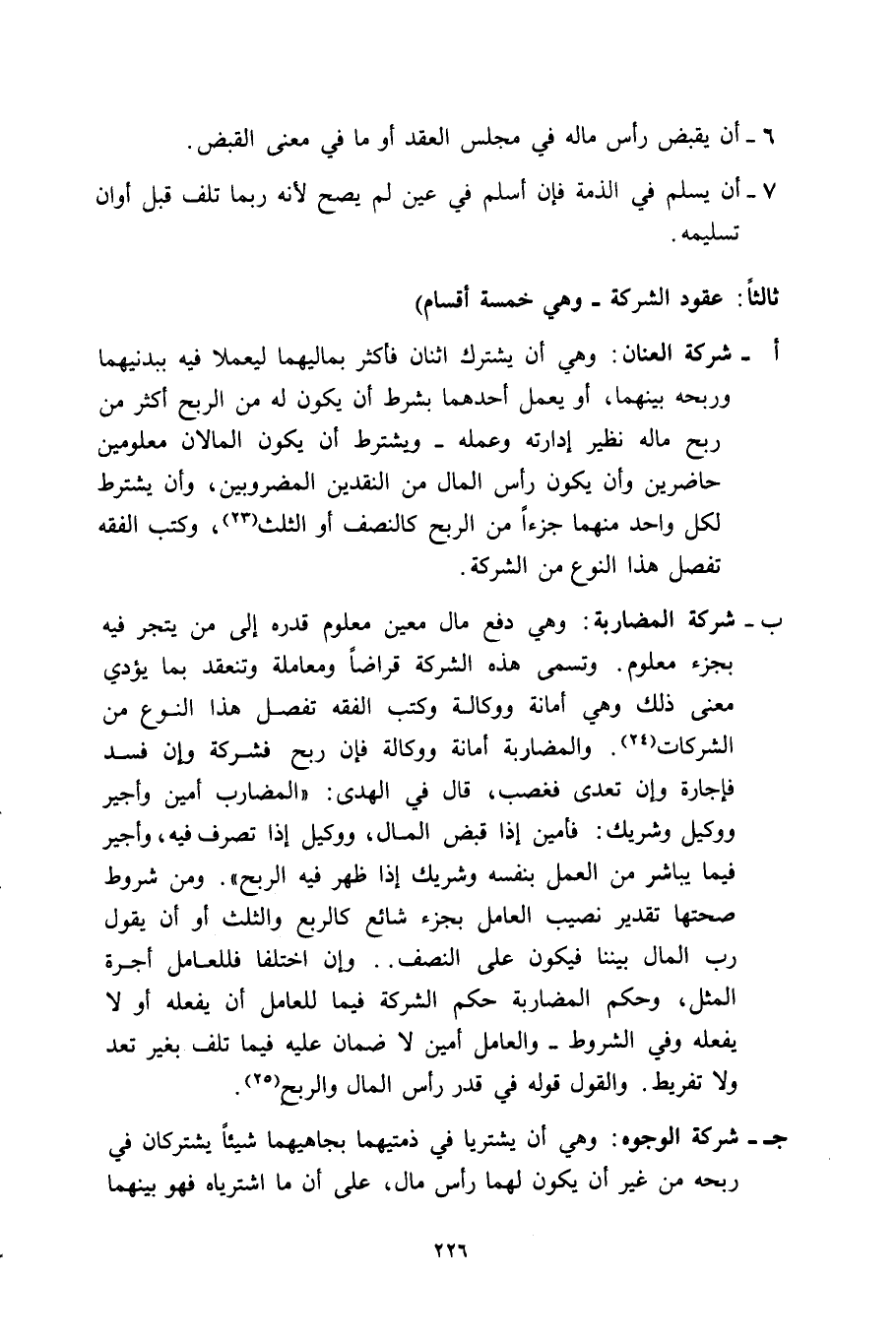 أ- شركة العنان: وهي أن يشترك اثنانِ فأكثر بمالَيْهما ليعملا فيه ببدنيهما وربحه بينهما، أو يعمل أحدهما بشرط أن يكون له من الربح أكثر من ربح ماله نظير إدراته وعمله -ويشترط أن يكون المالان معلومين حاضرين وأن يكون رأس المال من النقدين المضروبين، وأن يشترط لكل واحد منهما جزءًا من الربح كالنصف أو الثلث23، وكتب الفقه تفصل هذا النوع من الشركة.