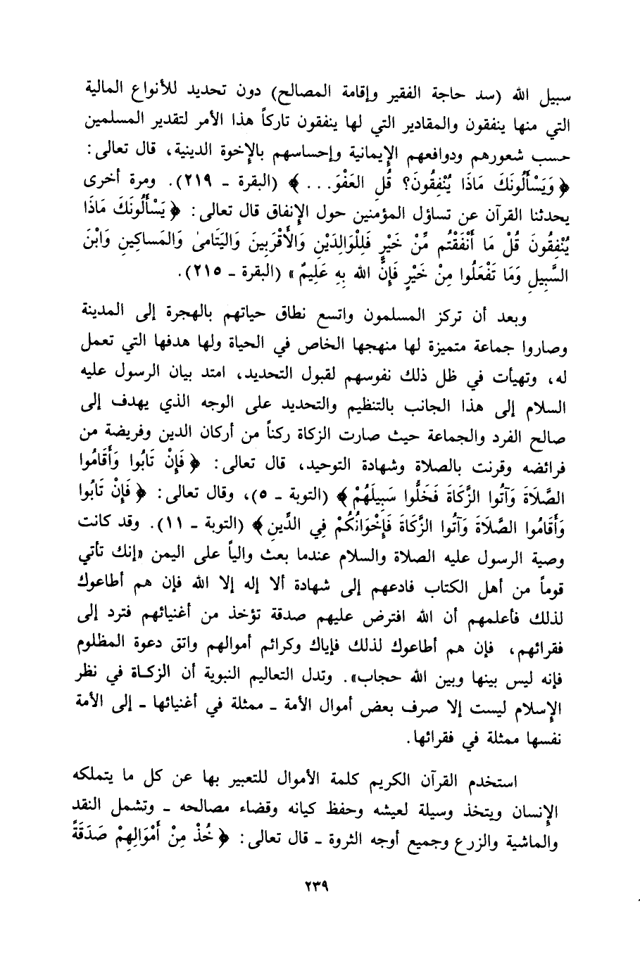 سبيل الله -سد حاجة الفقير وإقامة المصالح- دون تحديد للأنواع المالية التي منها ينفقون والمقادير التي لها ينفقون تاركًا هذا الأمر لتقدير المسلمين حسب شعورهم ودوافعهم الإيمانية وإحساسهم بالأخوة الدينية، قال تعالى: {وَيَسْأَلُونَكَ مَاذَا يُنفِقُونَ قُلِ الْعَفْوَ} [البقرة: 219] . ومرة أخرى يحدثنا القرآن عن تساؤل المؤمنين حلو الإنفاق قال تعالى: {يَسْأَلُونَكَ مَاذَا يُنفِقُونَ قُلْ مَا أَنفَقْتُمْ مِنْ خَيْرٍ فَلِلْوَالِدَيْنِ وَالأَقْرَبِينَ وَالْيَتَامَى وَالْمَسَاكِينِ وَابْنِ السَّبِيلِ وَمَا تَفْعَلُوا مِنْ خَيْرٍ فَإِنَّ اللَّهَ بِهِ عَلِيمٌ} [البقرة: 215] .