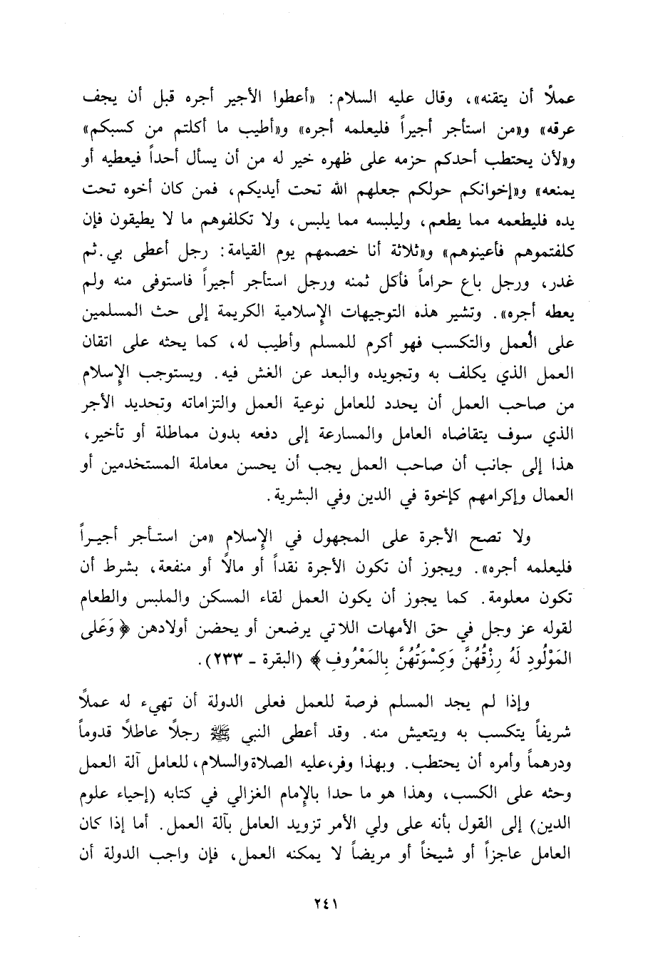 عملًا أن يتقنه"، وقال عليه السلام: "أعطوا الأجير أجره قبل أن يجف عرقه" و "من استأجر أجيرًا فليعلمه أجره" و "أطيب ما أكلتم من كسبكم" و "لأن يحتطب أحدكم حزمة على ظهره خير له من أن يسأل أحدًا فيعطيه أو يمنعه" و "إخوانكم حولكم جعلهم الله تحت أيديكم، فمن كان أخوه تحت يده فليطعمه مما يطعم، وليلبسه مما يلبس، ولا تكلفوهم ما لا يطيقون فإن كلفتموهم فأعينوهم" و "ثلاثة أنا خصمهم يوم القيامة رجل أعطى بي. ثم غدر ورجل باع حرامًا فأكل ثمنه ورجل استأجر أجيرا فاستوفى منه ولم يعطه أجره". وتشير هذه التوجيهات الإسلامية الكريمة إلى حث المسلمين على العمل والتكسب فهو أكرم للمسلم وأطيب له، كما يحثه على إتقان العمل الذي يكلف به وتجويده والبعد عن الغش فيه. ويستوجب الإسلام من صاحب العمل أن يحدد للعامل نوعية العمل والتزاماته وتحديد الأجر الذي سوف يتقاضاه العامل والمسارعة إلى دفعه بدون مماطلة أو تأخير، هذا إلى جانب أن صاحب العمل يجب أن يحسن معاملة المستخدمين أو العمال وإكرامهم كإخوة في الدين وفي البشرية.