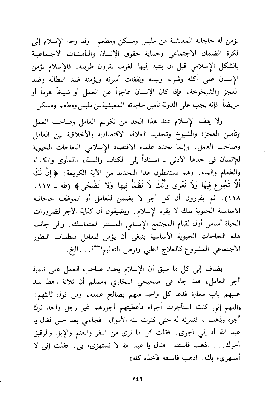 ولا يقف الإسلام عند هذا الحد من تكريم العامل وصاحب العمل وتأمين العجزة والشيوخ وتحديد العلاقة الاقتصادية والأخلاقية بين العامل وصاحب العمل، وإنما يحدد علماء الاقتصاد الإسلامي الحاجات الحيوية للإنسان في حدها الأدنى -استنادا إلى الكتاب والسنة، بالمأوى والكساء والطعام والماء. وهم يستنبطون هذا التحديد من الآية الكريمة: {إِنَّ لَكَ أَلاَّ تَجُوعَ فِيهَا وَلا تَعْرَى، وَأَنَّكَ لا تَظْمَأُ فِيهَا وَلا تَضْحَى} [طه: 117، 118] . ثم يقررون أن كل أجر لا يضمن للعامل أو الموظف حاجاته الأساسية الحيوية تلك لا يقره الإسلام. ويضيفون أن كفاية الأجر لضرورات الحياة أساس أول لقيام المجتمع الإنساني المستقر المتماسك. وإلى جانب هذه الحاجات الحيوية الأساسية ينبغي أن يؤمن للعامل متطلبات التطور الاجتماعي المشروع كالعلاج الطبي وفرص التعليم33 ... إلخ.