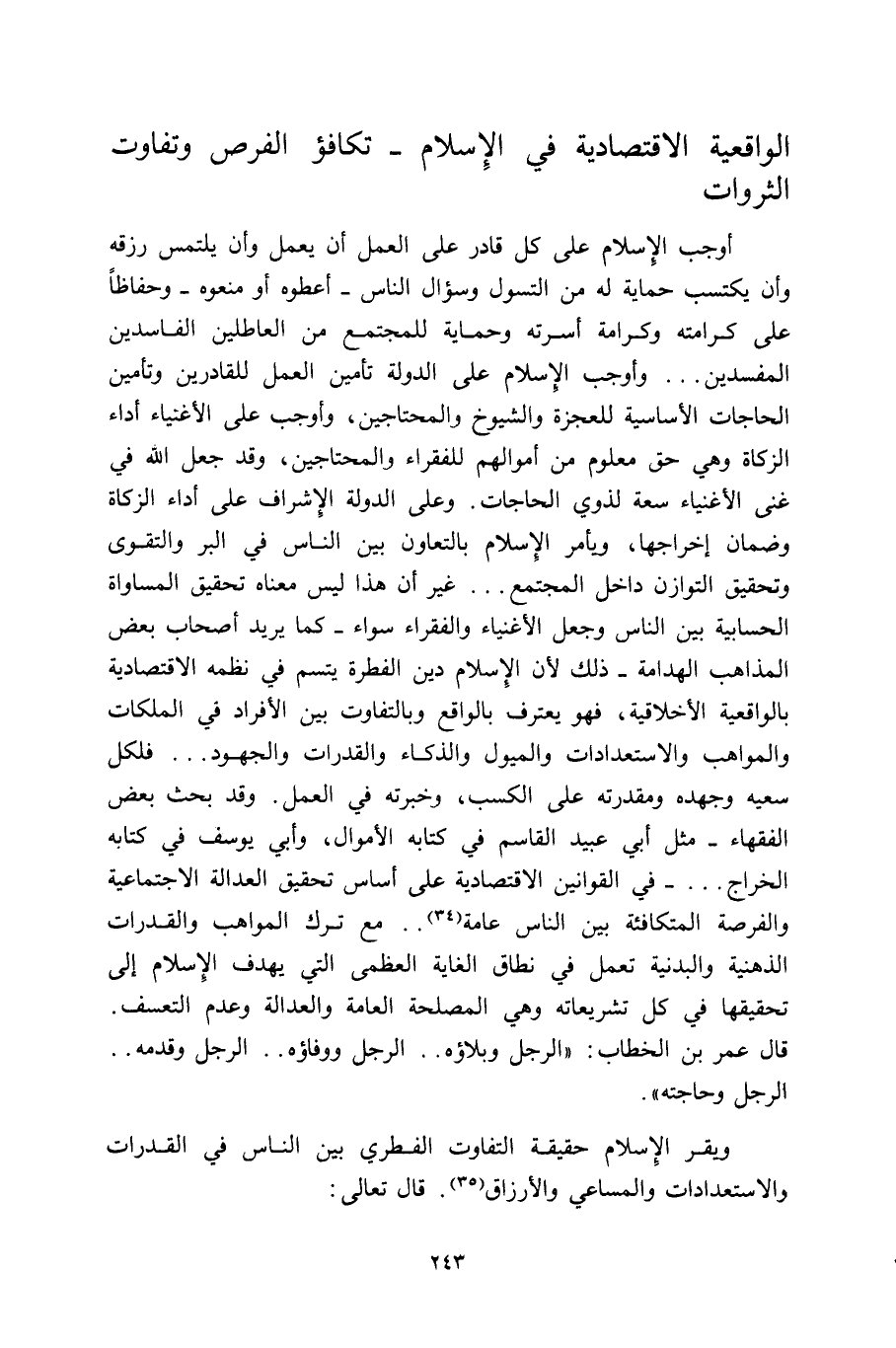 وأوجب الإسلام على كل قادر على العمل أن يعمل وأن يلتمس رزقه وأن يكتسب حماية له من التسول وسؤال الناس -أعطوه أو منعوه- وحفاظًا على كرامته وكرامة أسرته وحماية للمجتمع من العاطلين الفاسدين المفسدين ... وأوجب الإسلام على الدولة تأمين العمل للقادرين وتأمين الحاجات الأساسية للعجزة والشيوخ والمحتاجين، وأوجب على الأغنياء أداء الزكاة وهي حق معلوم من أموالهم للفقراء والمحتاجين، وقد جعل الله في غنى الأغنياء سعة لذوي الحاجات. وعلى الدولة الإشراف على أداء الزكاة وضمان إخراجها، ويأمر الإسلام بالتعاون بين الناس في البر والتقوى وتحقيق التوازن داخل المجتمع ... غير أن هذا ليس معناه تحقيق المساواة الحسابية بين الناس وجعل الأغنياء والفقراء سواء -كما يريد أصحاب بعض المذاهب الهدامة- ذلك لأن الإسلام دين الفطرة يتسم في نظمه الاقتصادية بالواقعية الأخلاقية، فهو يعترف بالواقع وبالتفاوت بين الأفراد في الملكات والمواهب والاستعدادات والميول والذكاء والقدرات والجهود ... فلكل سعيه وجهده ومقدرته على الكسب، وخبرته في العمل. وقد بحث بعض الفقهاء -مثل أبي عبيد القاسم في كتابه الأموال، وأبي يوسف في كتابه الخراج- في القوانين الاقتصادية على أساس تحقيق العدلة الاجتماعية والفرصة المتكافئة بين الناس عامة34.. مع ترك المواهب والقدرات الذهنية والبدنية تعمل في نطاق الغاية العظمى التي يهدف الإسلام إلى تحقيقها في كل تشريعاته وهي المصلحة العامة والعدالة وعدم التعسف. قال عمر بن الخطاب: الرجل وبلاؤه.. الرجل ووفاؤه.. الرجل وقدمه.. الرجل وحاجته.