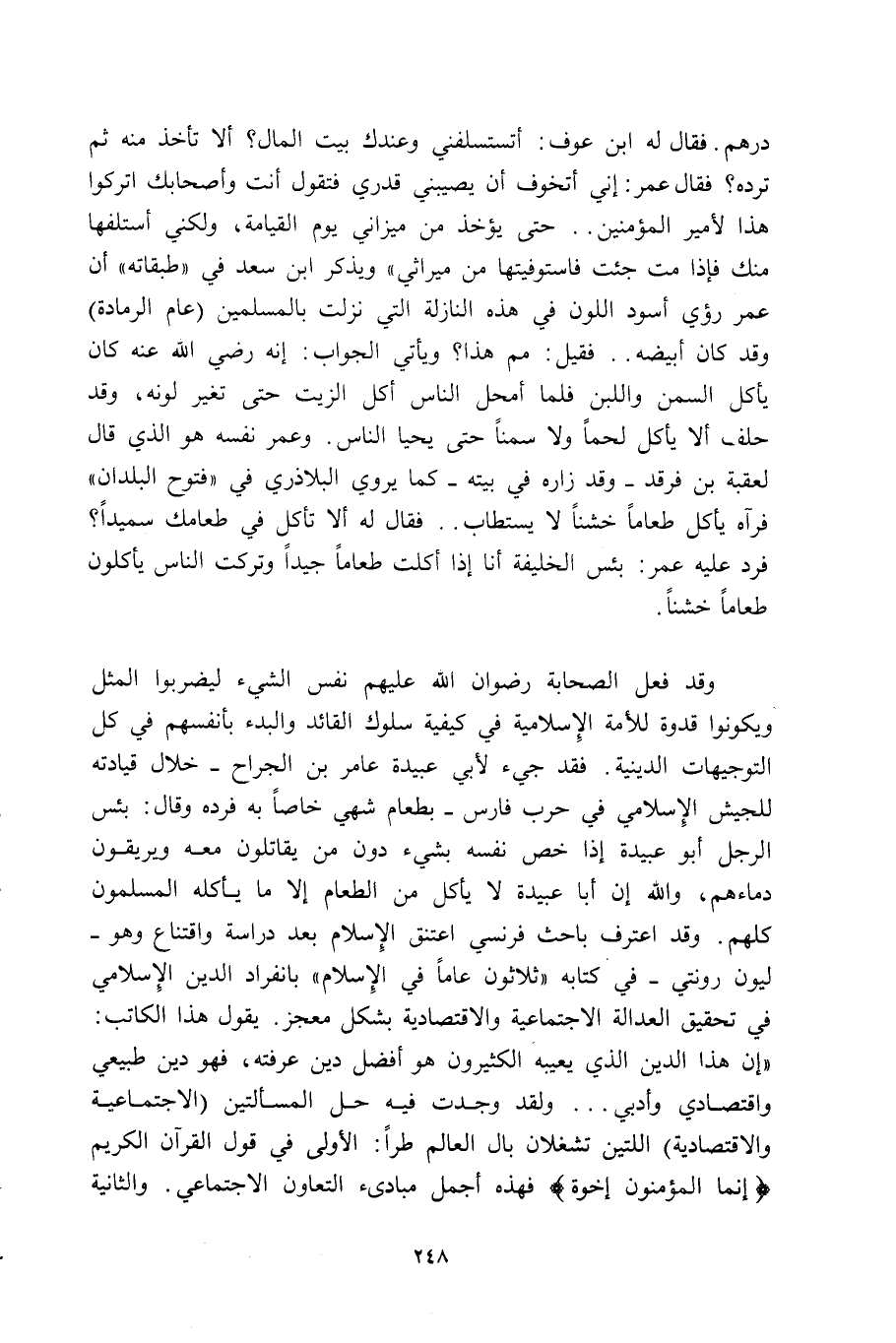 وقد فعل الصحابة رضوان الله عليهم نفس الشيء ليضربوا المثل ويكونوا قدوة للأمة الإسلامية في كيفية سلوك القائد والبدء بأنفسهم من كل التوجيهات الدينية. فقد جيء لأبي عبيدة عامر بن الجراح -خلال قيادته للجيش الإسلامي في حرب فارس- بطعام شهي خاصا به فرده وقال: بئس الرجل أبو عبيدة إذا خص نفسه بشيء دون من يقاتلون معه ويريقون دماءهم، والله إن أبا عبيدة لا يأكل من الطعام إلا ما أكله المسلمون كلهم. وقد اعترف باحث فرنسي اعتنق الإسلام بعد دراسة واقتناع وهو -ليون رونتي- في كتابه "ثلاثون عاما في الإسلام" بانفراد الدين الإسلامي في تحقيق العدالة الاجتماعية والاقتصادية بشكل معجز. يقول هذا الكاتب: "إن هذا الدين الذي يعيبه الكثيرون هو أفضل دين عرفته، فهو دين طبيعي واقتصادي وأدبي ... ولقد وجدت فيه حل المسألتين الاجتماعية والاقتصادية اللتين تشغلان بال العالم طرا: الأولى في قول القرآن الكريم {إنما المؤمنون إخوة} فهذه أجمل مبادئ التعاون الاجتماعي. والثانية