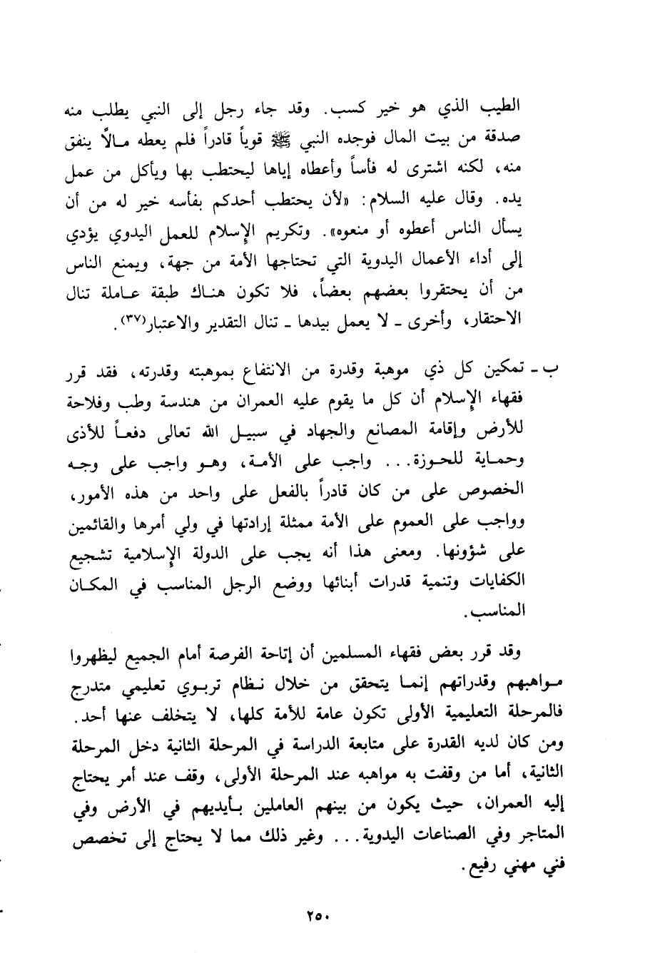 الطيب الذي هو خير كسب. وقد جاء رجل إلى النبي يطلب منه صدقة من بيت المال فوجده النبي -صلى الله عليه وسلم- قويا قادرا فلم يعطه مالا ينفق منه، لكنه اشترى له فأسا وأعطاه إياه ليحتطب بها ويأكل من عمل يده. وقال عليه السلام: "لأن يحتطب أحدكم بفأسه خير له من أن يسأل الناس أعطوه أو منعوه". وتكريم الإسلام للعمل اليدوي يؤدي إلى أداء الأعمال اليدوية التي تحتاجها الأمة من جهة، ويمنع الناس من أن يحتقروا بعضهم بعضا، فلا تكون هناك طبقة عاملة تنال الاحتقار، وأخرى -لا يعمل بيدها- تنال التقدير والاعتبار37.