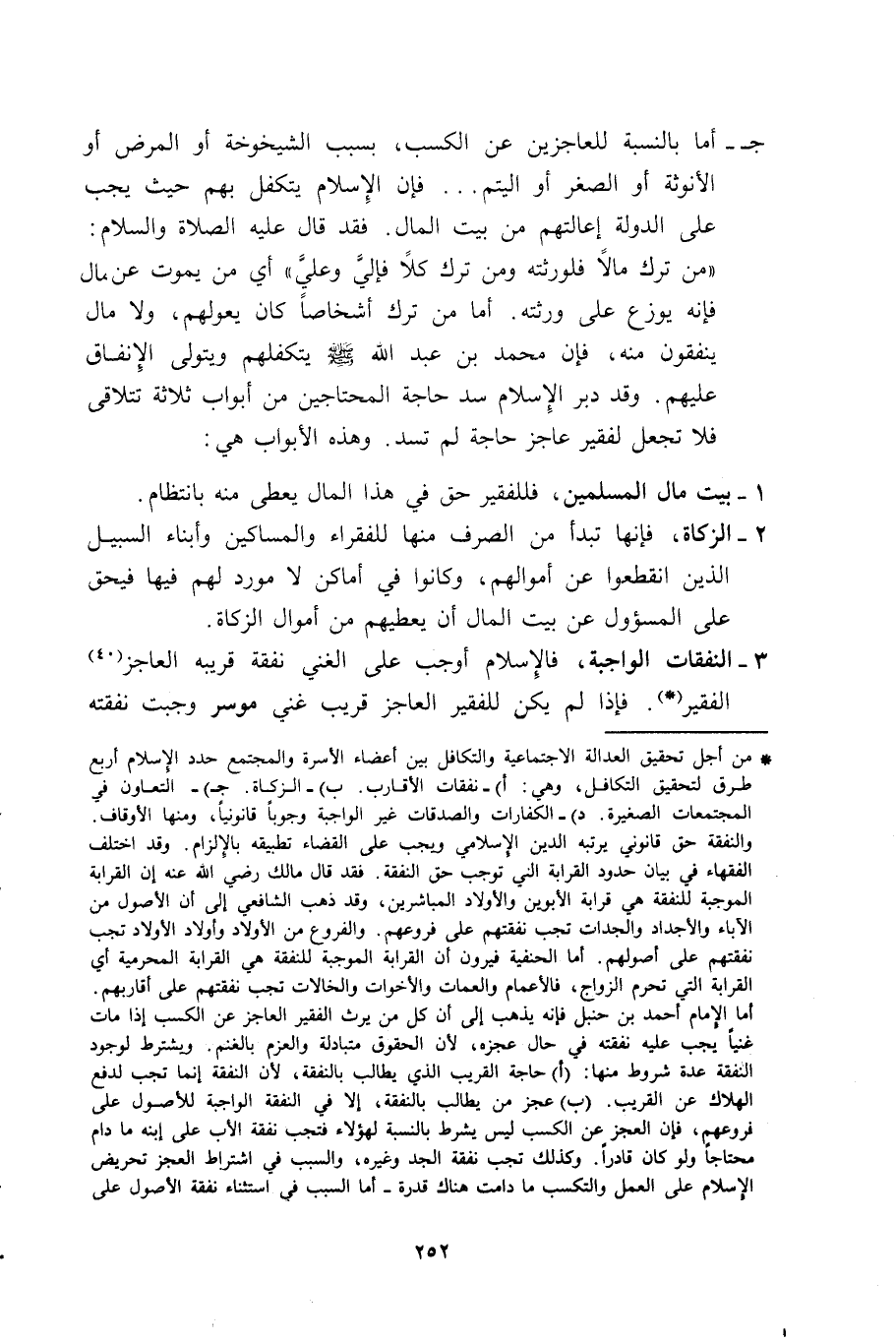 ج- أما بالنسبة للعاجزين عن الكسب، بسبب الشيخوخة أو المرض أو الأنوثة أو الصغر أو اليتم ... فإن الإسلام يتكفل بهم حيث يجب على الدولة إعالتهم من بيت المال. فقد قال عليه الصلاة والسلام: "من ترك مالا فلورثته ومن ترك كلا فإليَّ وعلَيَّ" أي من يموت عن مال فإنه يوزع على ورثته. أما من ترك أشخاصًا كان يعولهم، ولا مال ينفقون منه، فإن محمد بن عبد الله صلى الله عليه وسلم يتكفلهم ويتولى الإنفاق عليهم. وقد دبر الإسلام سد حاجة المحتاجين من أبواب ثلاثة تتلاقى فلا تجعل لفقير حاجة لم تسد. وهذه الأبواب هي: