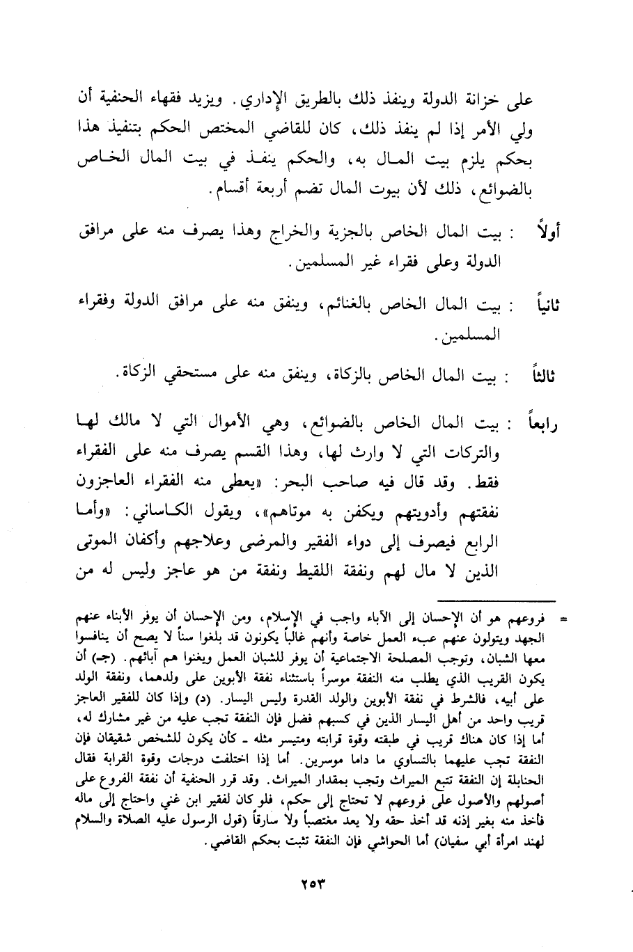 = فروعهم هو أن الإحسان إلى الآباء واجب في الإسلام، ومن الإحسان أن يوفر الأبناء عنهم الجهد ويتولون عنهم عبء العمل خاصة وأنهم غالبا يكونون قد بلغوا سنا لا يصح أن ينافسوا معها الشبان، وتوجب المصلحة الاجتماعية أن يوفر للشبان العمل ويغنوا هم آباءهم. ج- أن يكون القريب الذي يطلب منه النفقة موسرا باستثناء نفقة الأبوين على ولدهما، ونفقة الولد على أبيه، فالشرط في نفقة الأبوين والولد القدرة وليس اليسار. د- وإذا كان للفقير العاجز قريب واحد من أهل اليسار الذين في كسبهم فضل فإن النفقة تجب عليه من غير مشارك له، أما إذا كان هناك قريب في طبقته وقوة قرابته ومتيسر مثله - كأن يكون للشخص شقيقان فإن النفقة تجب عليهما بالتساوي ما داما موسرين. أما إذا اختلفت درجات وقوة القرابة فقال الحنابلة إن النفقة تتبع الميراث وتجب بمقدار الميراث. وقد قرر الحنفية أن نفقة الفروع على أصولهم والأصول على فروعهم لا تحتاج إلى حكم، فلو كان لفقير ابن غني واحتاج إلى ماله فأخذ منه بغير إذنه قد أخذ حقه ولا يعد مغتصبا ولا سارقا "قول الرسول عليه الصلاة والسلام لهند امرأة أبي سفيان" أما الحواشي فإن النفقة تثبت بحكم القاضي.