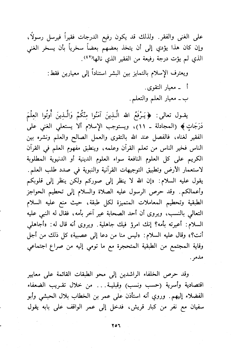 يقول تعالى: {يََرْفَعِ اللَّهُ الَّذِينَ آمَنُوا مِنْكُمْ وَالَّذِينَ أُوتُوا الْعِلْمَ دَرَجَاتٍ} [المجادلة: 11] ويستوجب الإسلام ألا يستعلي الغني على الفقير لغناه، فالفصل عند الله بالتقوى والعمل الصالح والعلم ونشره بين الناس فخير الناس من تعلم القرآن وعلمه، وينطبق مفهوم العلم في القرن الكريم على كل العلوم النافعة سواء العلوم الدينية أو الدنيوية المطلوبة لاستعمار الأرض وتطبيق التوجيهات القرآنية والنبوية في صدد طلب العلم. يقول عليه السلام: "إن الله لا ينظر إلى صوركم ولكن ينظر إلى قلوبكم وأعمالكم". وقد حرص الرسول -عليه الصلاة والسلام- إلى تحطيم الحواجز الطبقية وتحطيم المعاملات المتميزة لكل طبقة، حيث منع عليه السلام التعالي بالنسب، ويروى أن أحد الصحابة عير آخر بأمه، فقال له النبي عليه السلام: "أعيرته بأمه؟ إنك امرؤ فيك جاهلية". ويروى أنه قال له: "أجاهلي أنت؟ " وقال عليه السلام: "ليس منا من دعا إلى عصبية" كل ذلك من أجل وقاية المجتمع من الطبقية المتحجرة مع ما تومي إليه من صراع اجتماعي مدمر.
