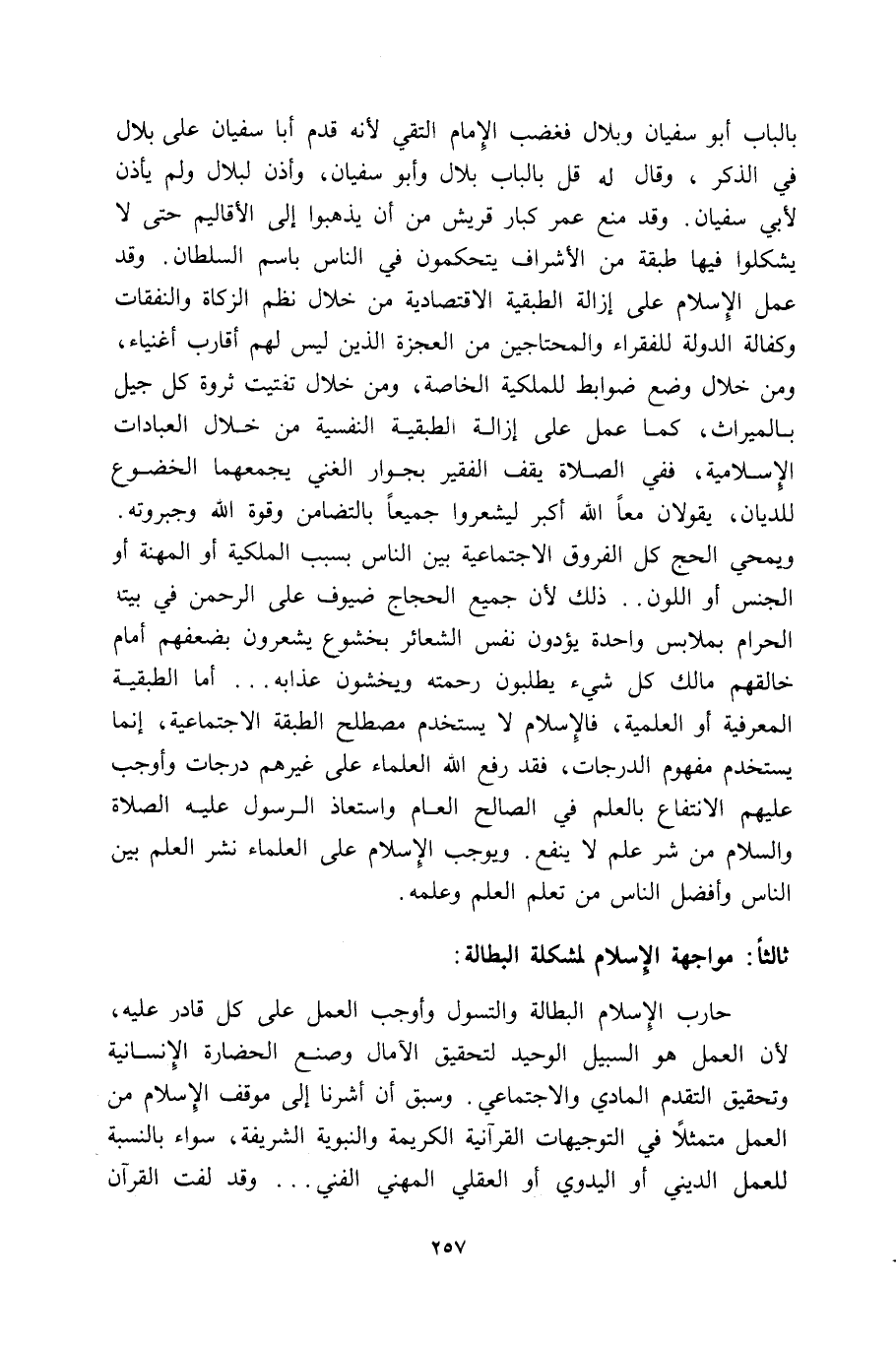 بالباب أبو سفيان وبلال فغضب الإمام التقي لأنه قدم أبا سفيان على بلال في الذكر، وقال له قل بالباب بلال وأبو سفيان، وأذن لبلال ولم يأذن لأبي سفيان. وقد منع عمر كبار قريش من أن يذهبوا إلى الأقاليم حتى لا يشكبوا فيه طبقة من الأشراف يتحكمون في الناس باسم السلطان. وقد عمل الإسلام على إزالة الطبقية الاقتصادية من خلال نظم الزكاة والنفقات وكفالة الدولة للفقراء والمحتاجين من العجزة الذين ليس لم أقارب أغنياء، ومن خلال وضع ضوابط للملكية الخاصة، ومن خلال تفتيت ثروة كل جيل بالميراث، كما عمل على إزالة الطبقية النفسية من خلال العبادات الإسلامية، ففي الصلاة يقف الفقير بجوار الغني يجمعها الخضوع للديان، يقولان معا الله أكبر ليشعروا جميعا بالتضامن وقوة الله وجبروته.