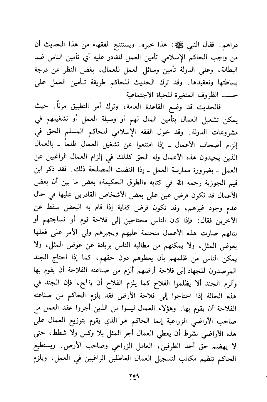 فالحديث قد وضع القاعدة العامة، وترك أمر التطبيق مرنا. حيث يمكن تشغيل العمال بتأمين المال لهم أو وسيلة العمل أو تشغيلهم في مشروعات الدولة. وقد خول الفقه الإسلامي للحاكم المسلم الحق في إلزام أصحاب الأعمال -إذا امتنعوا عن تشغيل العمال ظلما- بالعمال الذين يجيدون هذه الأعمال وله الحق كذلك في إلزام العمال الراغبين عن العمل -بضرورة ممارسة العمل- إذا اقتضت المصلحة ذلك. فقد ذكر ابن قيم الجوزية رحمه الله في كتابه "الطرق الحكيمة" بعض ما بين أن بعض الأعمال قد تكون فرض عين على بعض الأشخاص القادرين عليها في حال عدم وجود غيرهم، وقد تكون فرض كفاية إذا قام به البعض سقط عن الآخرين فقال: فإذا كان الناس محتاجين إلى فلاحة قوم أو نساجتهم أو بنائهم صارت هذه الأعمال متحتمة عليهم ويجبرهم ولي الأمر على فعلها بعوض المثل، ولا يمكنهم من مطالبة الناس بزيادة عن عوض المثل، ولا يمكن الناس من ظلمهم بأن يعطوهم دون حقهم، كما إذا احتاج الجند المرصدون للجهاد إلى فلاحة أرضهم ألزم من صناعة الفلاحة أن يقوم بها وألزم الجند ألا يظلموا الفلاح كما يلزم الفلاح أن يفلح، فإن الجند في هذه الحالة إذا احتاجوا إلى فلاحة الأرض فقد يلزم الحاكم من صناعته الفلاحة أن يقوم بها. وهؤلاء العمال ليسوا من الذين أجروا عقد العمل مع صاحب الأراضي الزراعية إنما الحاكم هو الذي يقوم بتوزيع العمال على هذه الأراضي بشرط أن يعطي العمال أجر المثل بلا وكس ولا شطط، حتى لا يهضم حق أحد الطرفين، العامل الزراعي وصاحب الأرض. ويستطيع الحاكم تنظيم مكاتب لتسجيل العمال العاطلين الراغبين في العمل، ويلزم
