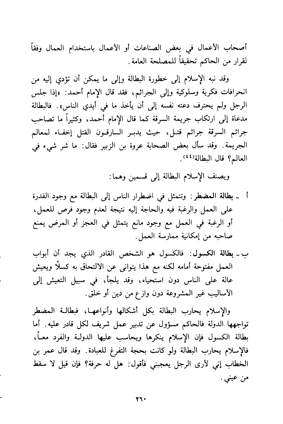 والإسلام يحارب البطالة بكل أشكالها وأنواعها، فبطالة المضطر تواجهها الدولة فالحاكم مسئول عن تدبير عمل شريف لكل قادر عليه. أما بطاقة الكسول فإن الإسلام ينكرها ويحاسب عليها الدولة والفرد معا، فالإسلام يحارب البطالة ولو كانت بحجة التفرغ للعبادة. وقد قال عمر بن الخطاب إني لأرى الرجل يعجبني فأقول: هل له حرفة؟ فإن قيل لا سقط من عيني.
