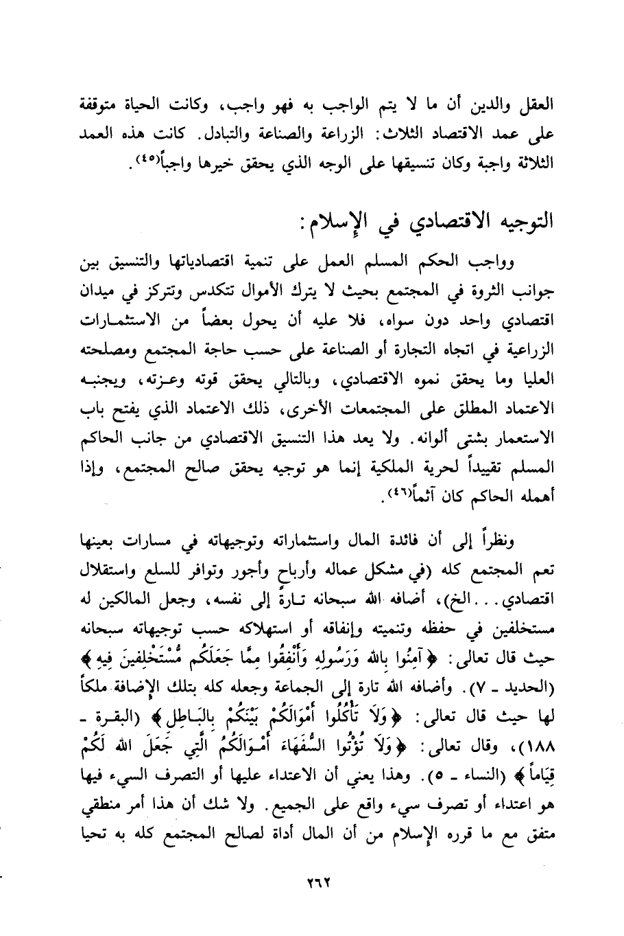 العقل والدين أن ما لا يتم الواجب إلا به فهو واجب، وكانت الحياة متوقفة على عمد الاقتصاد الثلاث: الزراعة والصناعة والتبادل. كانت هذه العمد الثلاثة واجبة وكان تنسيقها على الوجه الذي يحقق خيرها واجبا45.