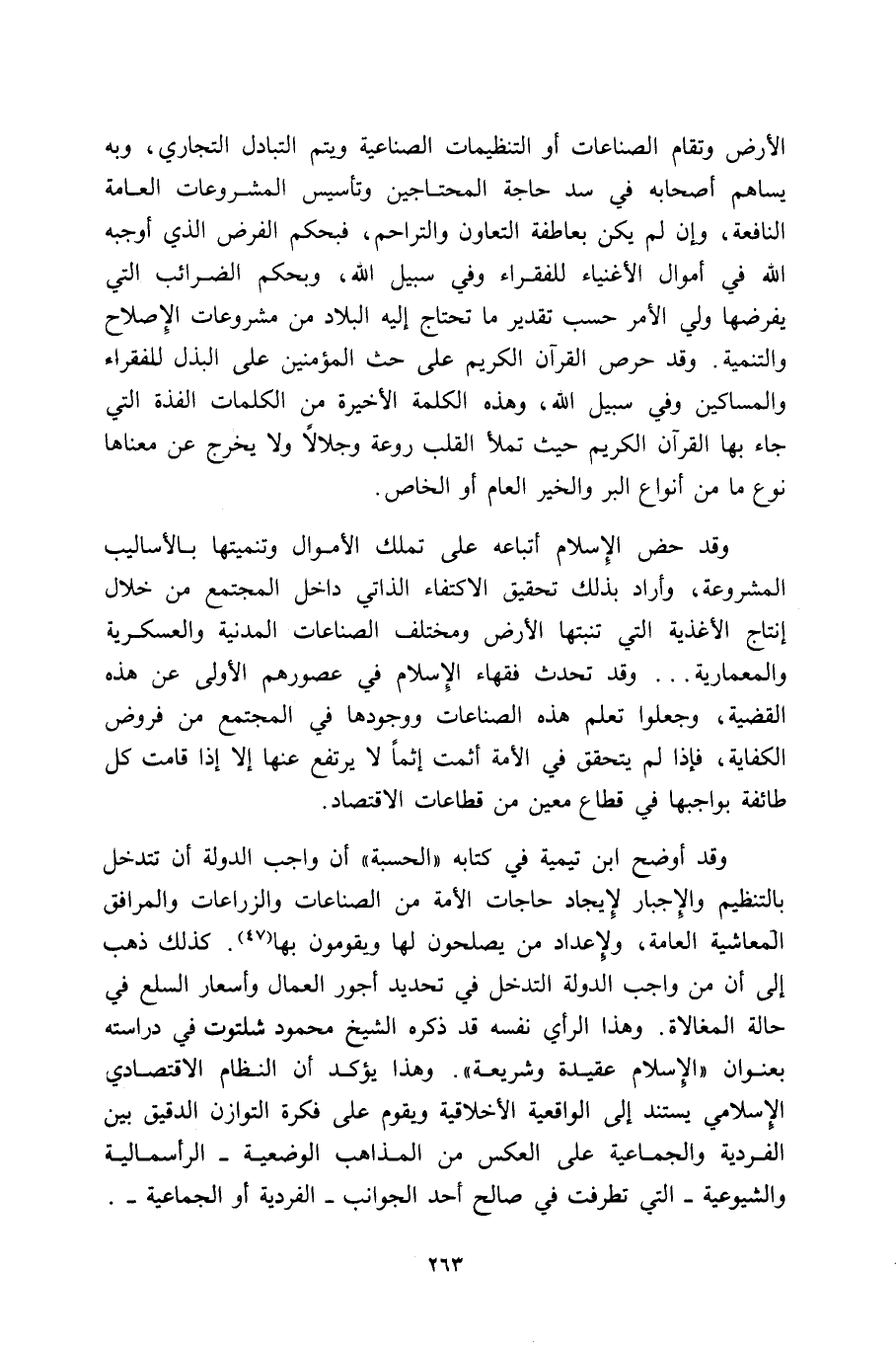 وقد أوضح ابن تيمية في كتابه "الحسبة" أن واجب الدولة أن تتدخل بالتنظيم والإجبار لإيجاد حاجات الأمة من الصناعات والزراعات والمرافق المعاشية العامة، ولإعداد من يصلحون لها ويقومون بها47. كذلك ذهب إلى أن من واجب الدولة التدخل في تحديد أجور العمال وأسعار اسلع في حالة المغالاة. وهذا الرأي نفسه قد ذكره الشيخ محمود شلتوت في دراسته بعنوان "الإسلام عقيدة وشريعة". وهذا يؤكد أن النظام الاقتصادي الإسلامي يستند إلى الواقعية الأخلاقية ويقوم على فكرة التوازن الدقيق بين الفردية والجماعية على العكس من المذاهب الوضعية -الرأسمالية والشيوعية- التي تطرفت في صالح أحد الجوانب -الفردية أو الجماعية.