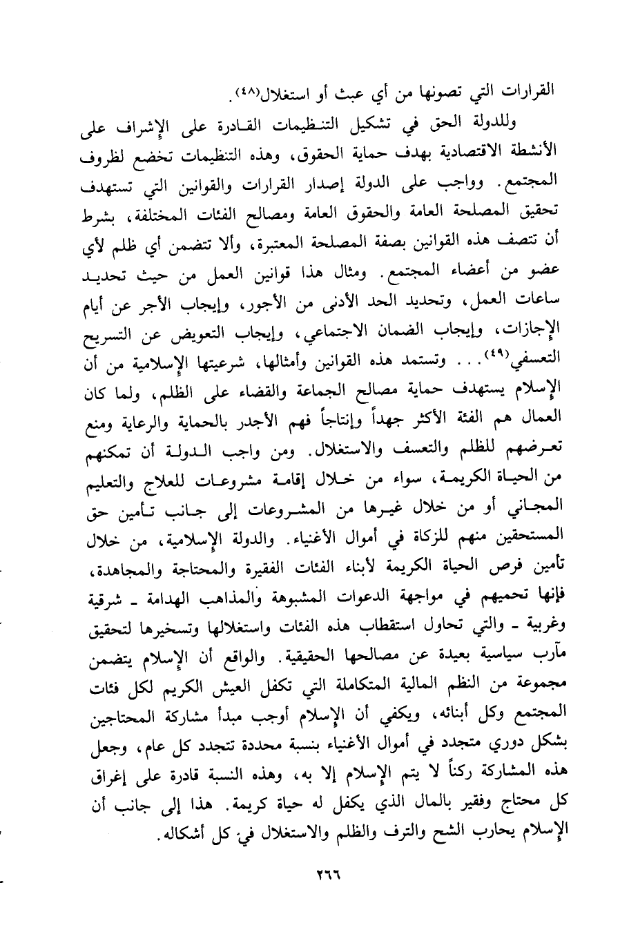 وللدولة الحق في تشكيل التنظيمات القادرة إلى الإشراف على الأنشطة الاقتصادية بهدف حماية الحقوق، وهذه التنظيمات تخضع لظروف المجتمع. وواجب على الدولة إصدار القرارات والقوانين التي تستهدف تحقيق المصحلة العامة والحقوق العامة ومصالح الفئات المختلفة، بشرط أن تتصف هذه القوانين بصفة المصلحة المعتبرة، وألا تتضمن أي ظلم لأي عضو من أعضاء المجتمع. ومثال هذا قوانين العمل من حيث تحديد ساعات العمل، وتحديد الحد الأدنى من الأجور، وإيجاب الأجر عن أيام الإجازات، وإيجاب الضمان الاجتماعي، وإيجاب التعويض عن التسريح التعسفي49.. وتستمد هذه القوانين وأمثالها، شرعيتها الإسلامية من أن الإسلام يستهدف حماية مصالح الجماعة والقضاء على الظلم، ولما كان العمال هم الفئة الأكثر جهدا وإنتاجا فهم الأجدر بالحماية والرعاية ومنع تعرضهم للظلم والتعسف والاستغلال. ومن واجب الدولة أن تمكنهم من الحياة الكريمة، سواء من خلال إقامة مشروعات للعلاج والتعليم المجاني أو من خلال غيرها من المشروعات إلى جانب تأمين حق المستحقين منهم للزكاة في أموال الأغنياء. والدولة الإسلامية، من خلال تأمين فرص الحياة الكريمة لأبناء الفئات الفقيرة والمحتاجة والمجاهدة، فإنها تحميهم في مواجهة الدعوات المشبوهة والمذاهب الهدامة -شرقية وغربية- والتي تحاول استقطاب هذه الفئات واستغلالها وتخسيرها لتحقيق مآرب سياسية بعيدة عن مصالحها الحقيقة. والواقع أن الإسلام يتضمن مجموعة من النظم المالية المتكاملة التي تكفل العيش الكريم لكل فئات المجتمع وكل أبنائه، ويكفي أن الإسلام أوجب مبدأ مشاركة المحتاجين بشكل دوري متجدد في أموال الأغنياء بنسبة محددة تتجدد كل عام، وجعل هذه المشاركة ركنا لا يتم الإسلام إلا به، وهذه النسبة قادرة على إغراق كل محتاج وفقير بالمال الذي يكفل له حياة كريمة، هذا إلى جانب أن الإسلام يحارب الشح والترف والظلم والاستغلال في كل أشكاله.