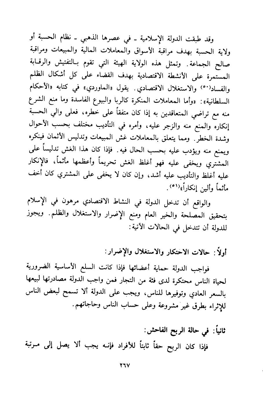 وقد طبقت الدولة الإسلامية -في عصرها الذهبي- نظام الحسبة أو ولاية الحسبة بهدف مراقبة الأسواق والمعاملات المالية والمبيعات ومراقبة صالح الجماعة. وتمثل هذه لولاية الهيئة التي تقوم بالتفتيش والرقابة المستمرة على الأنشطة الاقتصادية بهدف القضاء على كل أشكال الظلم والفساد50 والاستغلال الاقتصادي. يقول الماوردي في كتابه "الأحكام السلطانية": "وأما المعاملات المنكرة كالربا والبيوع الفائدة وما منع الشرع منه مع تراضي المتعاقدين به إذ كان متفقا على خطره، فعلى والي الحسبة إنكاره والمنع منه والزجر عليه، وأمره في التأديب مختلف بحسب الأحوال وشدة الخطر. ومما يتعلق بالمعاملات غش المبيعات وتدليس الأثمان فينكره ويمنع منه ويؤدب عليه بحسب الحال فيه. فإذا كان الغش تدليسا على المشتري ويخفى عليه فهو أغلظ الغش تحريما وأعظمها مأثما، فالإنكار عليه أغلظ والتأديب عليه أشد، وإن كان لا يخفى على المشتري كان أخف مأثما وألين إنكارا"51.