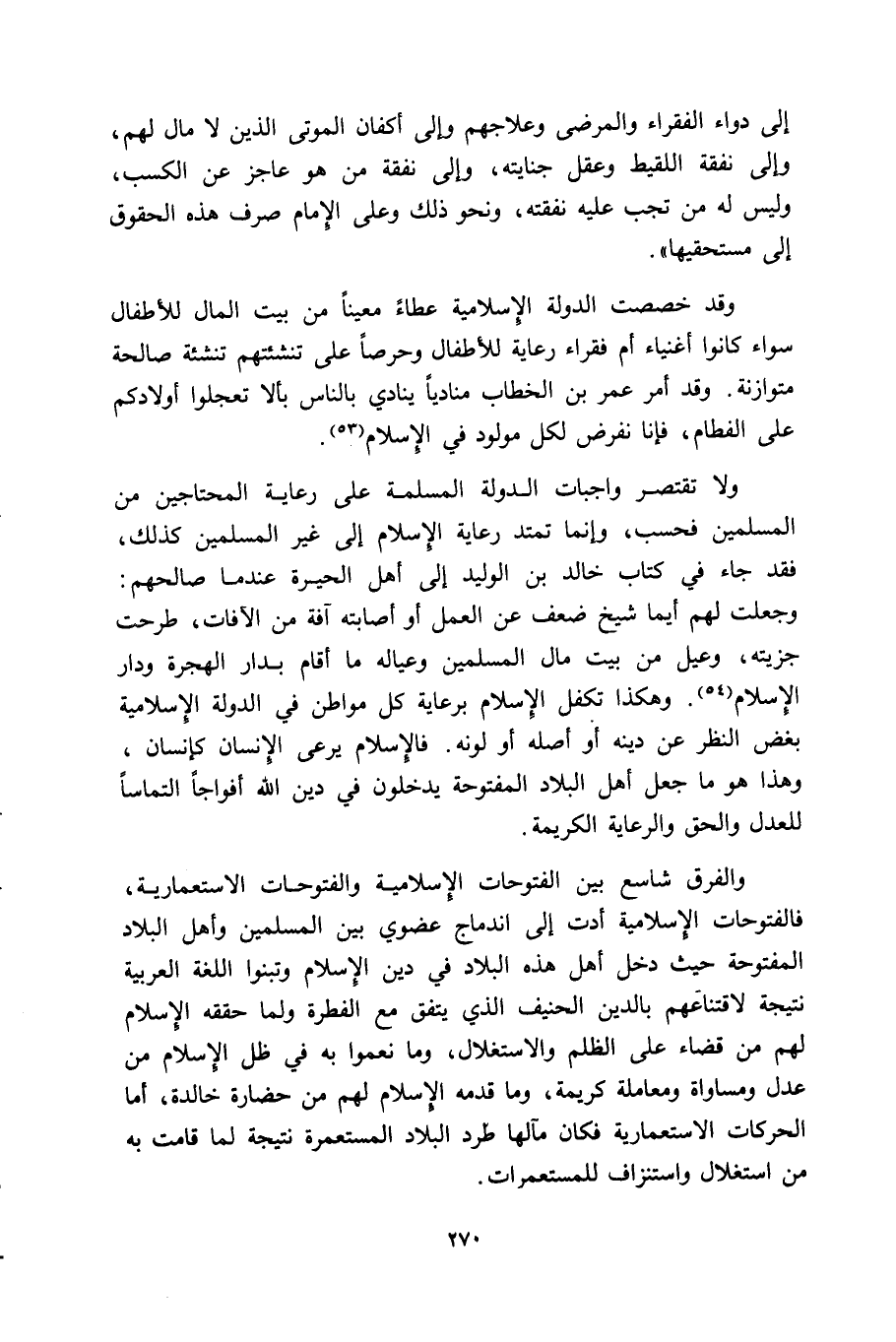 ولا تقتصر واجبات الدولة المسلمة على رعاية المحتاجين من المسلمين فحسب، وإنما تمتد رعاية الإسلام إلى غير المسلمين كذلك، فقد جاء في كتاب خالد بن الوليد إلى أهل الحيرة عندما صالحهم: وجعلت لهم أيما شيخ ضعف عن العمل أو أصابته آفة من الآفات، طرحت جزيته، وعيل من بيت مال المسلمين وعياله ما أقام بدار الهجرة ودار الإسلام54. وهكذا تكفل الإسلام برعاية كل مواطن في الدولة الإسلامية بغض النظر عن دينه أو أصله أو لونه. فالإسلام يرعى الإنسان كإنسان، وهذا هو ما جعل أهل البلاد المفتوحة يدخلون في دين الله أفواجا التماسا للعدل والحق والرعاية الكريمة.