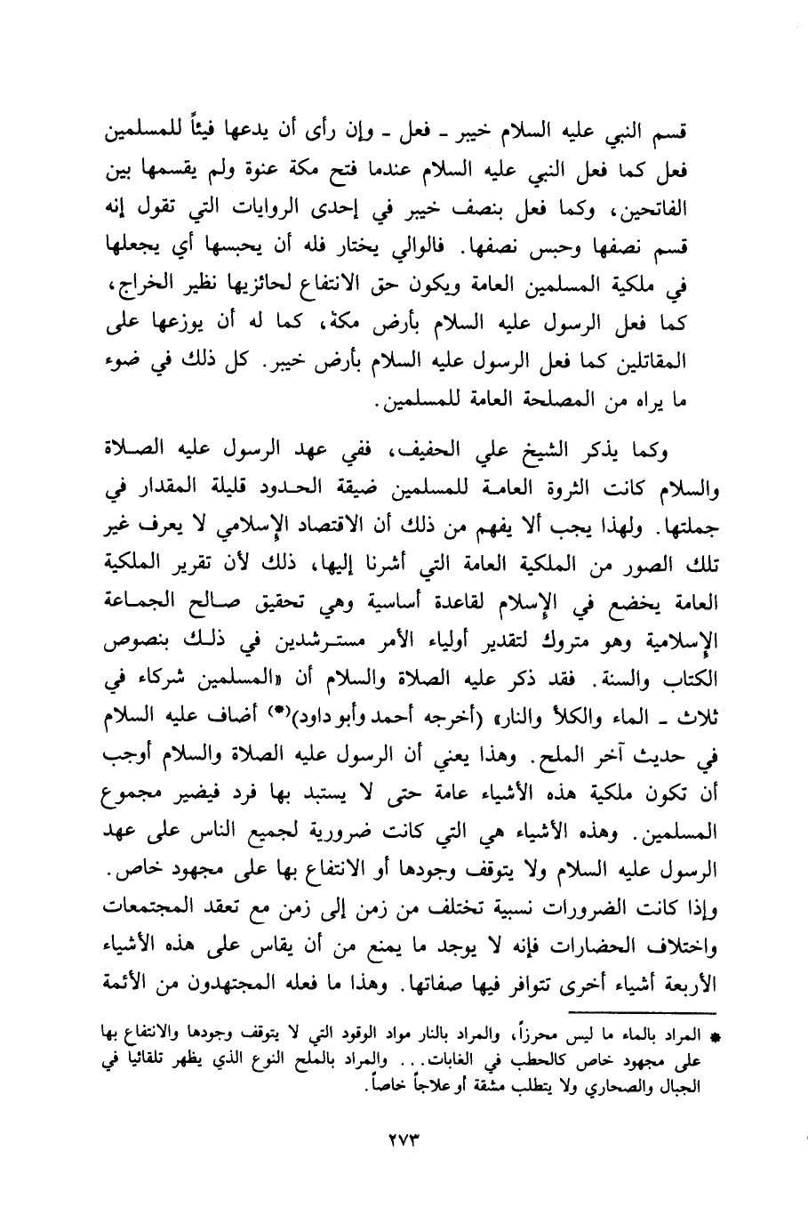 وكما يذكر الشيخ علي الحفيف، ففي عهد الرسول -عليه الصلاة والسلام- كانت الثروة العامة للمسلمين ضيقة الحدود قليلة المقدار في جملتها. ولهذا يجب ألا يفهم من ذلك أن الاقتصاد الإسلامي لا يعرف غير تلك الصور من الملكية العامة التي أشرنا إليها، ذلك لأن تقرير الملكية العامة يضع في الإسلام لقاعدة أساسية وهي تحقيق صالح الجماعة الكتاب والسنة. فقد ذكر عليه الصلاة والسلام: "المسلمون شركاء في ثلاثة: الماء والكلأ والنار" أخرجه أحمد وأبو داود* أضاف عليه السلام في حديث آخر الملح. وهذا يعني أن الرسول -عليه الصلاة والسلام- أوجب أن تكون ملكية هذه الأشياء هي التي كانت ضرورية لجميع الناس على عهد الرسول -عليه السلام- ولا يتوقف وجودها أو الانتفاع بها على مجهود خاص. واختلاف الحضارات فإنه لا يوجد ما يمنع من أن يقاس على هذه الأشياء الأربعة أشياء أخرى تتوافر فيها صفاتها. وهذا ما فعله المجتهدون من الأئمة