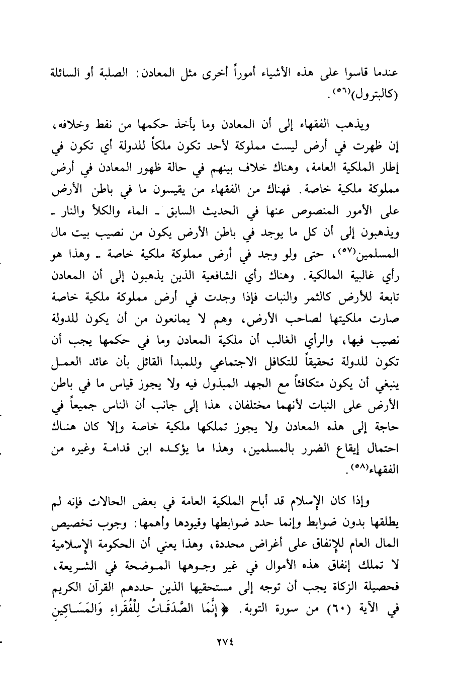 ويذهب الفقهاء إلى أن المعادن وما يأخذ حكمها من نفط وخلافه، إن ظهرت في أرض ليست مملوكة لأحد تكون ملكا للدولة أي تكون في إطار الملكية العامة، وهناك خلاف بينهم في حالة ظهور المعادن في أرض مملوكة خاصة. فناك من الفقهاء من يقيسون ما في باطن الأرض على الأمور المنصوص عنها في الحديث السباق -الماء والكلأ والنار- ويذهبون إلى أن كل ما يوجد في باطن الأرض يكون من نصيب بيت مال المسلمين57، حتى ولو وجد في أرض مملوكة ملكيةخاصة -وهذا هو رأي غالبية المالكية. وهناك رأي الشافعية الذين يذهبون إلى أن المعادن تابعة للأرض كالثمر والنبات فإذا وجدت في أرض مملوكة ملكيةخاصة صارت ملكيتها لصاحب الأرض، وهم لا يمانعون من أن يكون للدولة نصيب فيها، والرأي الغالب أن ملكية المعادن وما في حكمها يجب أن تكون للدولة تحقيقا للتكافل الاجتماعي وللمبدأ القائل بأن عائد العمل ينبغي أن يكون متكافئا مع الجهد المبذول فيه ولا يجوز قياس ما في باطن الأرض على النبات لأنهما مختلفان، هذا إلى جانب أن الناس جميعا في حاجة إلى هذه المعادن ولا يجوز تملكها ملكية خاصة وإلا كان هناك احتمال إيقاع الضرر بالمسلمين، وهذا ما يؤكده ابن قدامة وغيره من الفقهاء58.