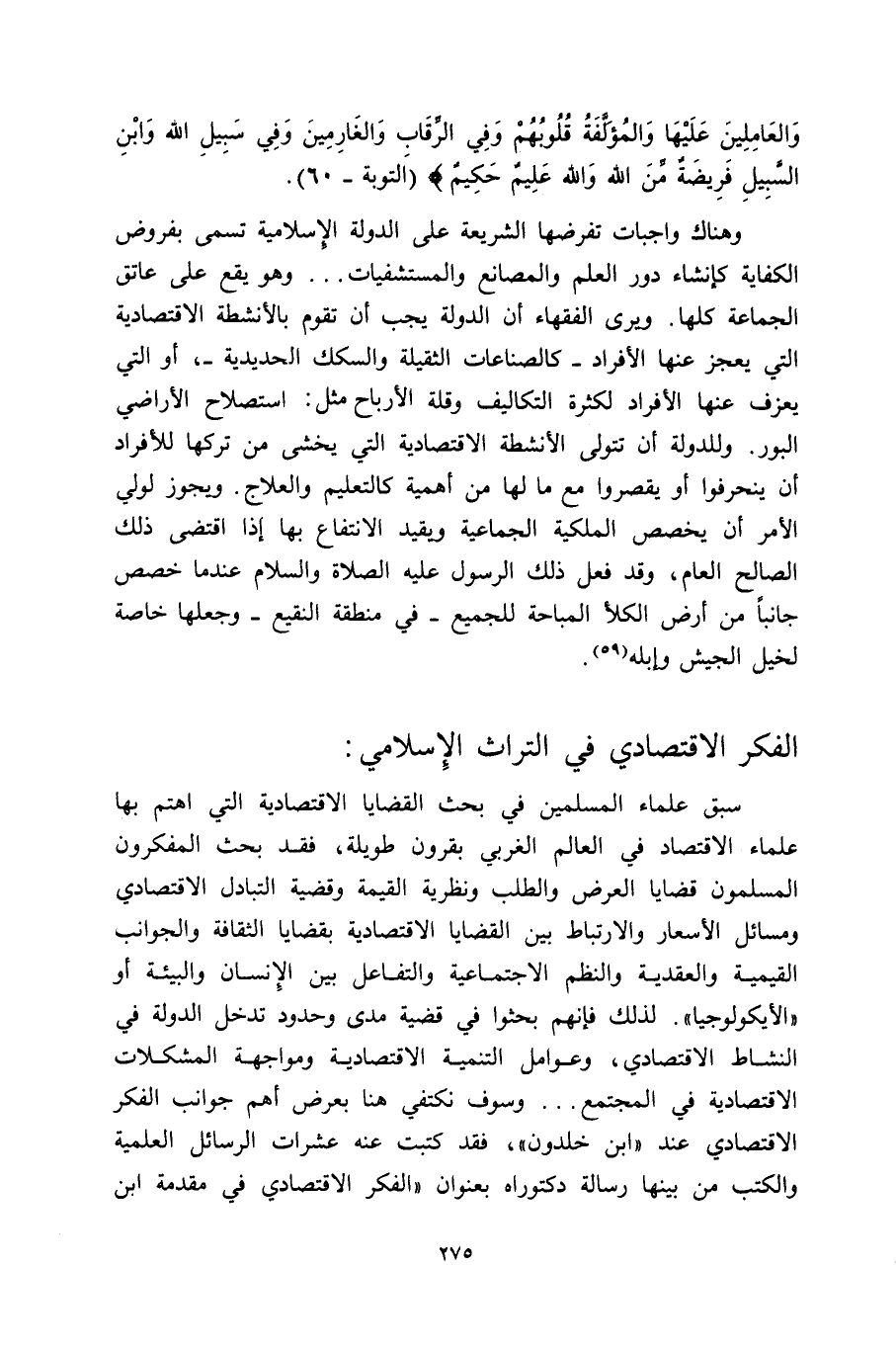 سبق علماء المسلمين في بحث القضايا الاقتصادية التي اهتم بها علماء الاقتصاد في العالم الغربي بقرون طويلة، فقد بحث المفكرون المسلمون قضايا العرض والطلب ونظرية القيمة وقضية التبادل الاقتصادي ومسائل الأسعار والارتباط بين القضايا الاقتصادية بقضايا الثقافة والجوانب القيمية والعقدية والنظم الاجتماعية والتفاعل بين الإنسان والبيئة أو الأيكولوجيا لذلك فإنهم بحثوا في قضية مدى وحدود تدخل الدولة في النشاط الاقتصادي، وعوامل التنمية الاقتصادية ومواجهة المشكلات الاقتصادية في المجتمع. ... وسوف نكتفي هنا بعرض أهم جوانب الفكر الاقتصادي عند ابن خلدون فقد كتبت عنه عشرات الرسائل العلمية والكتب من بينها رسالة دكتوراه بعنوان: الفكر الاقتصادي في مقدمة ابن
