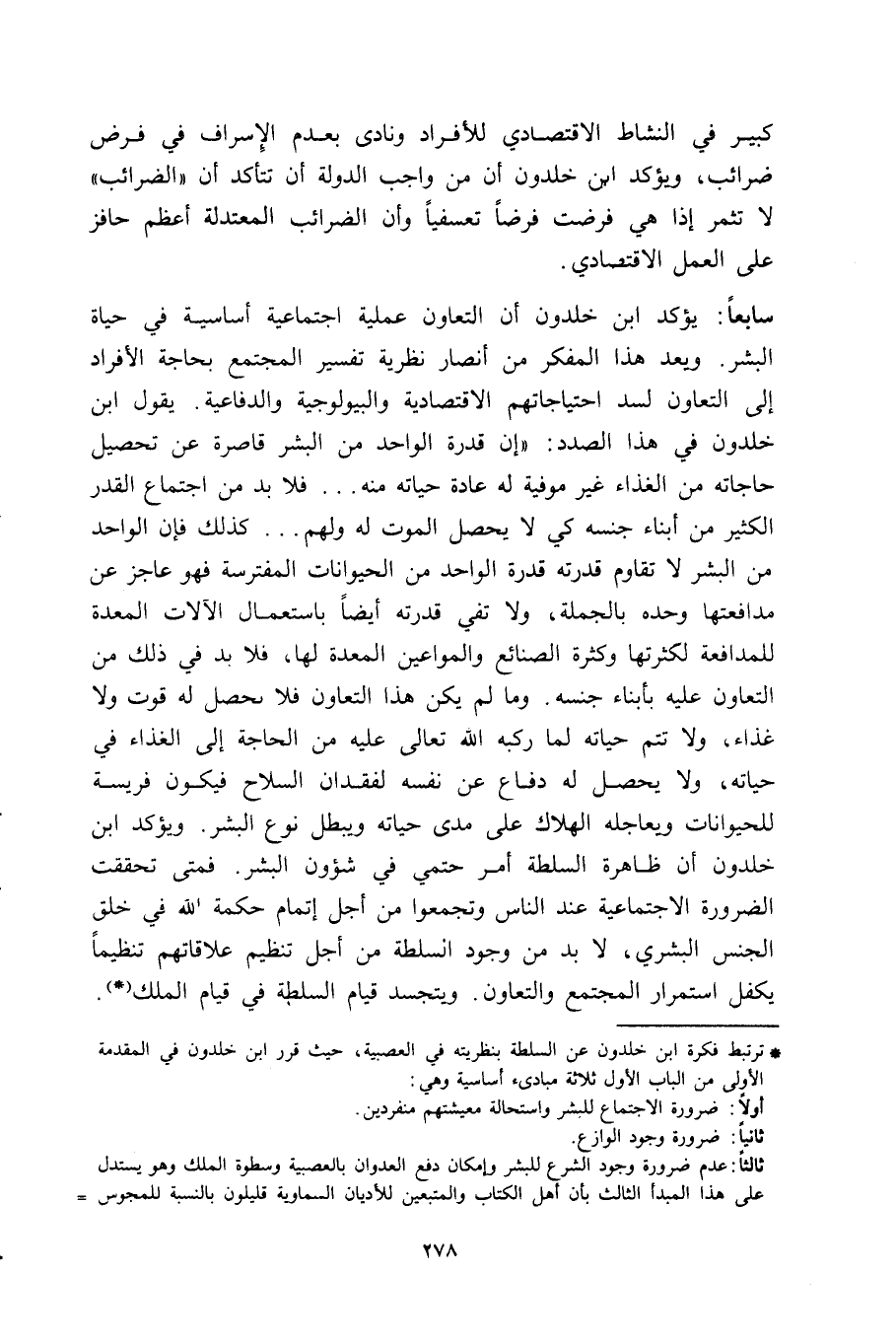 كبير في النشاط الاقتصادي للأفراد ونادى بعدم الإسراف في فرض ضرائب، ويؤكد ابن خلدون أن من واجب الدولة أن تتأكد أن "الضرائب" لا تثمر إذا هي فرضت فرضا تعسفيا وأن الضرائب المعتدلة أعظم حافظ على العمل الاقتصادي.