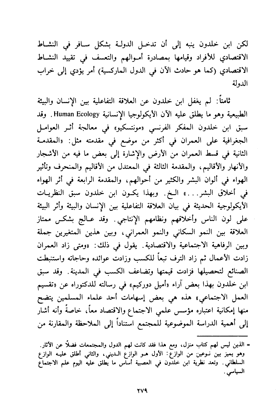 ثامنا: لم يغفل ابن خلدون عن العلاقة التفاعلية بين الإنسان والبيئة الطبيعية وهو ما يطلق عليه الآن الأيكولوجيا الإنسانية human ecology. وقد سبق ابن خلدون المفكر الفرنسي "مونتسكيو" في معالجة أثر العوامل الجغرافية على العمران في أكثر من موضع في مقدمته مثل: "المقدمة الثانية في قسط العمران من الأرض والإشارة إلى بعض ما فيه من الأشجار والأنهار والأقاليم، والمقدمة الثالثة في المعتدل من الأقاليم والمنحرف وتأثير في أخلاق البشر" ... إلخ. وبهذا يكون ابن خلدون سبق النظريات الأيكولوجية الحديثة في بيان العلاقة التفاعلية بين الإنسان والبيئة وأثر البيئة على لون الناس وأخلاقهم ونظامهم الإنتاجي. وقد عالج بشكل ممتاز العلاقة بين النمو السكاني والنمو العمراني، وبين هذين المتغيرين جملة وبين الرفاهية الاجتماعية والاقتصادية. يقول في ذلك: ومتى زاد العمران زادت الأعمال ثم زاد الترف تبعا للكسب وزادت عوائده وحاجاته واستنبطت الصنائع لتحصيلها فزادت قيمتها وتضاعف الكسب في المدينة. وقد سبق ابن خلدون بهذا بعض آراء "أميل دوركيم" في رسالته للدكتوراه عن "تقسيم العمل الاجتماعي" هذه هي بعض إسهامات أحد علماء المسلمين يتضح منها إمكانية اعتباره مؤسس علمي الاجتماع والاقتصاد معًا، خاصة وأنه أشار إلى أهمية الدراسة الموضوعية للمجتمع استنادا إلى الملاحظة والمقارنة من