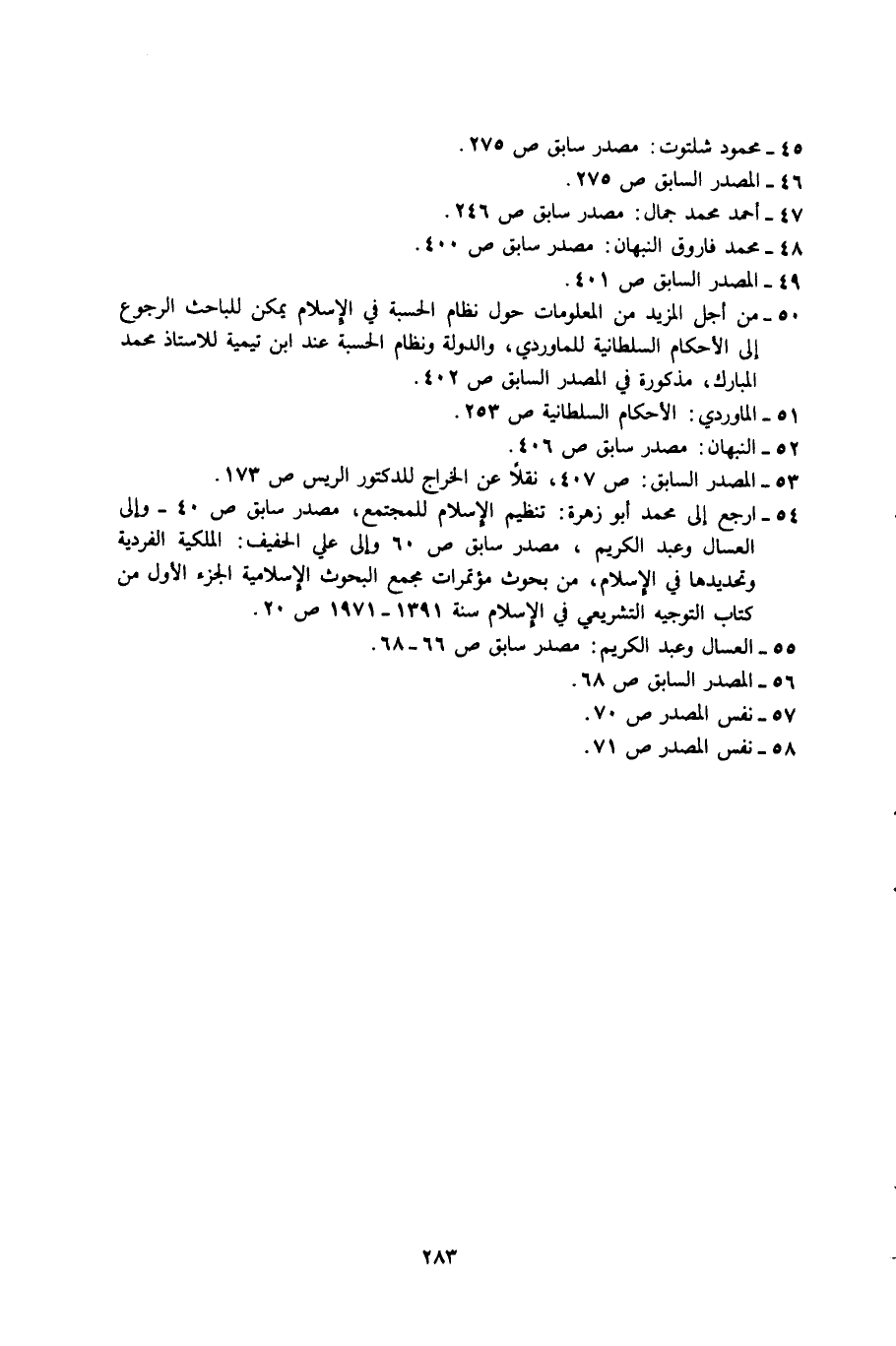 50- من أجل المزيد من المعلومات حول نظام الحسبة في الإسلام يمكن للباحث الرجوع إلى الأحكام السلطانية للماوردي، والدولة ونظام الحسبة عند ابن تيمية للاستاذ محمد المبارك، مذكورة في المصدر السابق ص402.