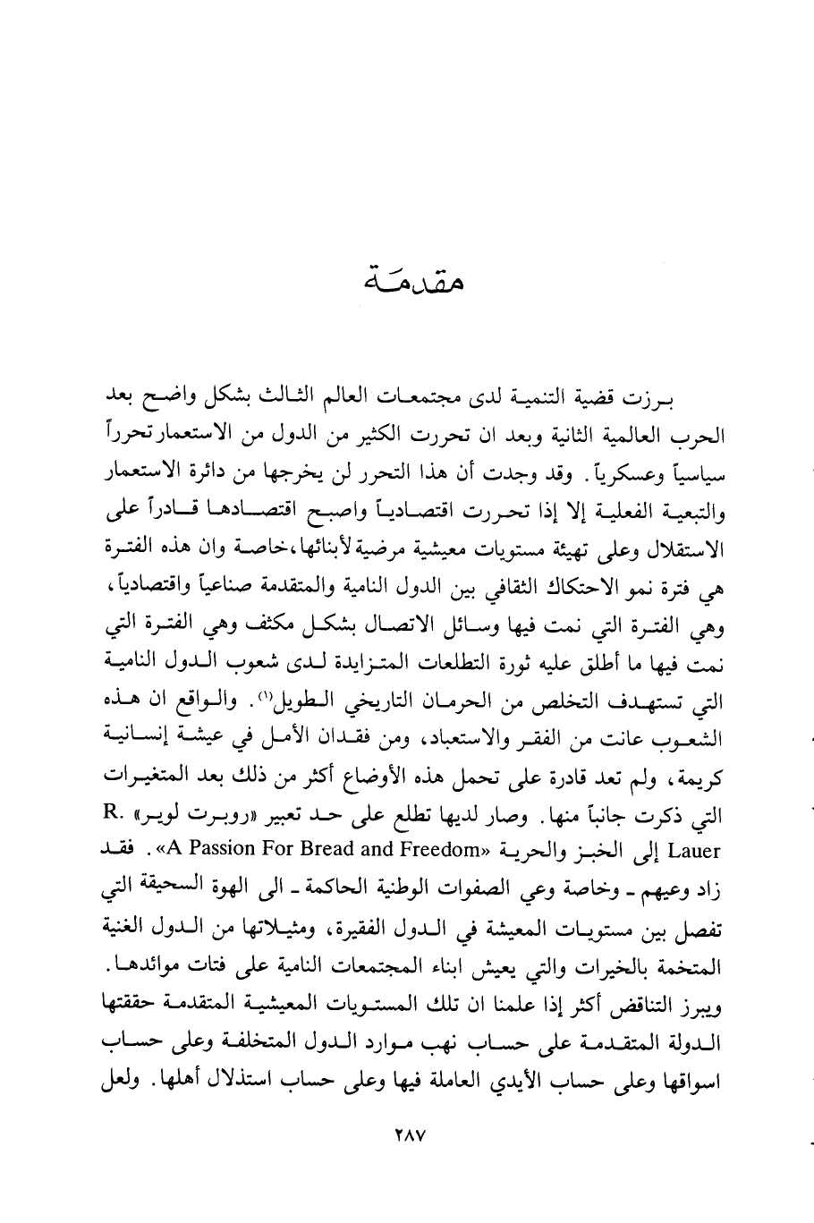 برزت قضية التنمية لدى مجتمعات العالم الثالث بشكل واضح بعد الحرب العالمية الثانية وبعد أن تحررت الكثير من الدول من الاستعمال تحررا سياسيا وعسكريا. وقد وجدت أن هذا التحرر لن يخرجها من دائرة الاستعمار والتبعية الفعلية إلا إذا تحررت اقتصاديا وأصبح اقتصادها قادرا على الاستقلال وعلى تهيئة مستويات معيشية مرضية لأبنائها، خاصة وأن هذه الفترة هي فترة نمو الاحتكاك الثقافي بين الدول النامية والمتقدمة صناعيا واقتصاديا وهي الفترة التي نمت فيه وسائل الاتصال بشكل مكثف وهي الفترة التي نمت فيها ما أطلق عليه ثورة التطلعات المتزايدة لدى شعوب الدول النامية التي تستهدف التخلص من الحرمان التاريخي الطويل1. والواقع أن هذه الشعوب عانت من الفقر والاستبعاد، ومن فقدان الأمل في عيشة إنسانية كريمة، ولم تعد قادرة على تحمل هذه الأوضاع أكثر من ذلك بعد المتغيرات التي ذكرت جانبا منها. وصار لديها تطلع على حد تعبير "روبرت لوير" R.lauer إلى الخبز والحرية A Passion For Bread and Freedom فقد زاد وعيهم -وخاصة وعي الصفوات الوطنية الحاكمة- إلى الهوة السحيقة التي تفصل بين مستويات المعيشة في الدول الفقيرة، ومثيلاتها من الدول الغنية المتخمة بالخيرات والتي يعيش أبناء المجتمعات النامية على فتات موائدها. وبرز التناقض أكثر إذا علمنا أن تلك المستويات المعيشية المتقدمة حققتها الدولة المتقدمة على حساب نهب موارد الدول المتخلفة وعلى حساب أسواقها وعلى حساب الأيدي العاملة فيها وعلى حساب استذلال أهلها. ولعل