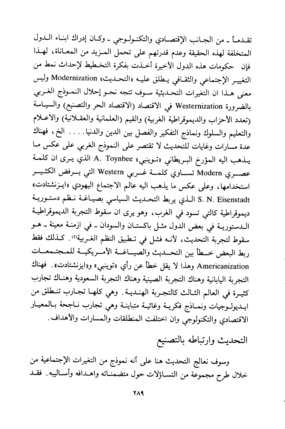 تقدما -من الجانب الاقتصادي والتكنولوجي- وكان إدراك أبناء الدول المتخلفة لهذه الحقيقة وعدم قدرتهم على تحمل المزيد من المعاناة، لهذا فإن حكومات هذه الدول الأخيرة أخذت بفكرة التخطيط لإحداث نمط من التغيير الاجتماعي والثقافي يطلق عليه "التحديث" modernization وليس معنى هذا أن التغيرات التحديثية سوف تتجه نحو إحلال النموذج الغربي بالضرورة westernization في الاقتصاد "الاقتصاد الحر والتصنيع" والسياسة "تعدد الأحزاب الديمقراطية الغربية" والقيم "العلمانية والعقلانية" والإعلام والتعليم والسلوك ونماذج التفكير والفصل بين الدنيا والدين ... إلخ، فهناك عدة مسارات وغايات للتحديث لا تقتصر على النموذج الغربي على عكس ما يذهب إليه المؤرخ البريطاني "توبنيبي" toynbee الذي يرى أن كلمة عصري omdern تساوي كلمة غربي western التي يرفض الكثير استخدامها، على عكس ما يذهب إليه عالم الاجتماع اليهودي "ايزنشتادت" s.n.eisenstadt الذي يربط التحديث السياسي بصياغة نظم دستورية ديمقراطية كالتي تسود في الغرب وهو يرى أن سقوط التجربة الديمقراطية الدستورية في بعض الدول مثل باكستان والسودان -في أزمة معينة- هو سقوط لتجربة التحديث، لأنه فضل في تطبيق النظم الغربية4، كذلك فقط ربط البعض خطأ بين التحديث والصياغة الأمريكية للمجتمعات americanization وهذا لا يقل خطأ عن رأي "توينيبي" و "إزنشتادت". فهناك التجربة اليابانية وهناك التجربة الصينية وهناك التجربة السعودية وهناك تجارب كثيرة في العالم الثالث كالتجرب الهندية. وهي كلها تجارب تنطلق من إيديولوجيات ونماذج فكرية وغائية متباينة وهي تجارب ناجحة بالمعيار الاقتصادي والتكنولوجي وإن اختلفت المنطلقات والمسارات والأهداف.