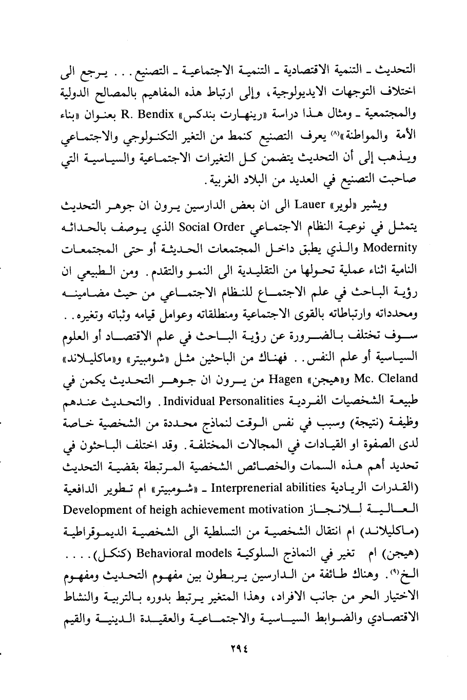 سوف تختلف بالضرورة عن رؤية الباحث في علم الاقتصاد أو العلوم السياسية أو علم النفس.. فهناك من الباحثين مثل "شومبيتر وماكليلاند Mc. Cleland وهيجن Hagen من يرون أن جواهر التحديث يمكن في طبيعة الشخصيات الفردية Individual Personalities. والتحديث عندهم وظيفة نتيجة وسبب في نفس الوقت لنماذج محددة من الشخصية خاصة لدى الصفوة أو القيادات في المجالات المختلفة. وقد اختلف الباحثون في تحديد أهم هذه السمات والخصائص الشخصية المرتبطة بقضية التحديث القدرات الريادية Interprenerial abilities- "شومبيتر" أم تطوير الدافعية العالية للإنجاز Development of high achievement motivation "ماكليلاند" أم انتقال الشخصية من التسلطية إلى الشخصية الديمقراطية "هيجن" أم تغير في النماذج السلوكية Behavioral models "كنكل".... إلخ9. وهناك طائفة من الدارسين يربطون بين مفهوم التحديث ومفهوم الاختيار الحر من جانب الأفراد، وهذا المتغير يرتبط بدوره بالتربية والنشاط الاقتصادي والضوابط السياسية والاجتماعية والعقيدة الدينية والقيم