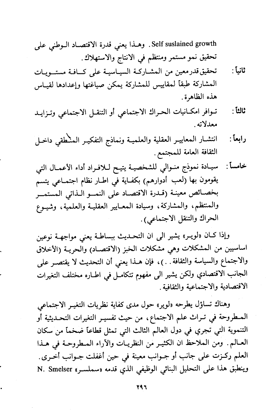 خامسًا: سيادة نموذج منوالي للشخصية يتيح للأفراد أداء الأعمال التي يقومون بها -لعب أدوارهم- بكافة في إطار نظام اجتماعي يتسم بخصائص معينة -قدرة الاقتصاد على النمو الذاتي المستمر والمنتظم، والمشاركة، وسيادة المعايير العقلية والعلمية، وشيوع الحراك والتنقل الاجتماعي.