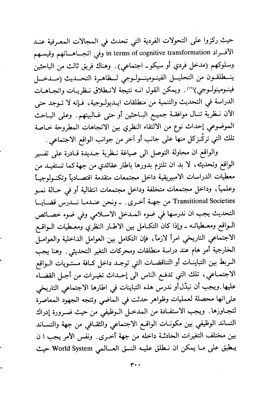والواقع أنّ محاولة التوصل إلى صياغة نظرية جديدة قادرة على تفسير الواقع وتحديثه، لا بد أن تلتزم بدورها بإطار عقائدي من جهة كما تستفيد من معطيات الدراسات الأمبيريقية داخل مجتمعات متقدمة اقتصاديًّا وتكنولوجيًّا وعلميًّا، وداخل مجتمعات متخلفة وداخل مجتمعات انتقالية أو في حالة نمو Translation Societies من جهة أخرى. ونحن عندما ندرس قضايا التحديث يجب أن ندرسها في ضوء المدخل الإسلامي وفي ضوء خصائص الواقع ومعطياته، وإذا كان التكامل بين الإطار النظري ومعطيات الواقع الاجتماعي التاريخي أمرًا لازمًا، فإن التكامل بين العوامل الداخلية والعوامل الخارجية أمر مهم عند دراسة منطلقات ومحركات التغير التحديثي. وهنا يجب الربط بين التباينات أو التناقضات التي توجد داخل كافة مستويات الواقع الاجتماعي، تلك التي تدفع الناس إلى إحداث تغيرات من أجل القضاء عليها. ويجب أن نبدل أو ندرس هذه التباينات في إطار ها الاجتماعي التاريخي على أنها محصلة لعمليات وظواهر حدثت في الماضي وتتجه الجهود المعاصرة لتجاوزها. يجب الاستفادة من المدخل الوظيفي من حيث ضرورة إدراك التساند الوظيفي بين مكونات الواقع الاجتماعي والثقافي من جهة والتساند بين مختلف التغيرات الحادثة داخله من جهة أخرى. ونفس الأمر يجب أن يطبق على ما يمكن أن نطلق عليه النسق العالمي World System حيث