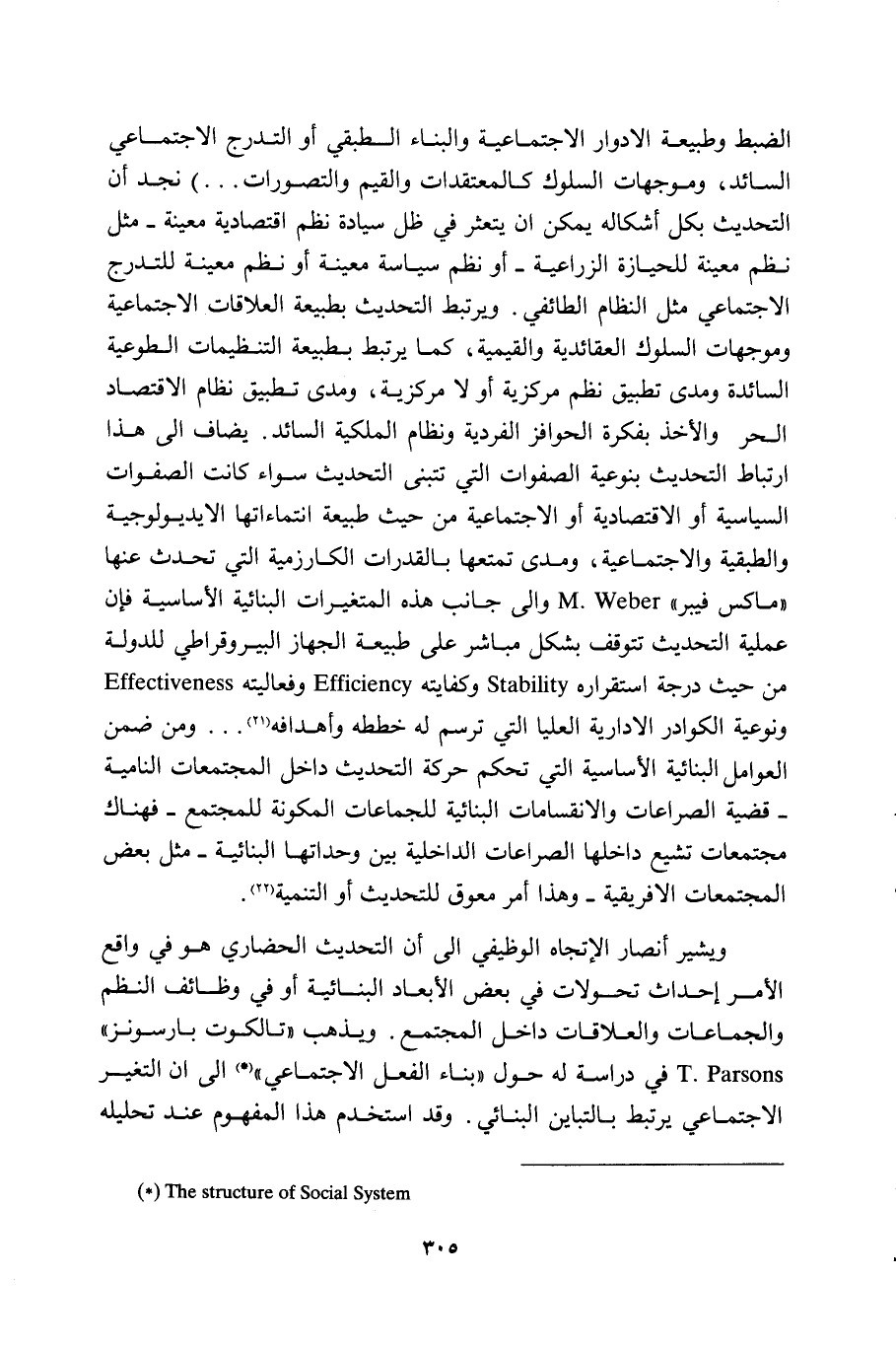 الضبط وطبيعة الأدوار الاجتماعية والبناء الطبقي أو التدرج الاجتماعي السائد، وموجهات السلوك كالمعتقدات والقيم والتصورات ... نجد أن التحديث بكل أشكاله يمكن أن يتعثر في ظل سيادة نظم اقتصادية معينة -مثل نظم معينة للحيازة الزراعية- أو نظم سياسة معينة أو نظم معينة للتدرج الاجتماعي مثل النظام الطائفي. ويرتبط التحديث بطبيعة العلاقات الاجتماعية وموجهات السلوك العقائدية والقيمية، كما يرتبط بطبيعة التنظيمات الطوعية السائدة ومدى تطبيق نظم مركزية أو لا مركزية، ومدى تطبيق نظام الاقتصاد الحر والأخذ بفكرة الحوافز الفردية ونظام الملكية السائد. يضاف إلى هذا ارتباط التحديث بنوعية الصفوات التي تتبنى التحديث سواء كانت الصفوات السياسية أو الاقتصادية أو الاجتماعية من حيث طبيعة انتماءاتها الإيديولوجية والطبقية والاجتماعية، ومدى تمتعها بالقدرات الكارزمية التي تحدث عنها "ماكس فيبر" M. Weber وإلى جانب هذه المتغيرات البنائية الأساسية فإن عملية التحديث تتوقف بشكل مباشر على طبيعة الجهاز البيروقراطي للدولة من حيث درجة استقراره Stability وكفايته Efficiiency وفعاليته Effectiveness ونوعية الكوادر الإدارية العليا التي ترسم له خططه وأهدافه21 ... ومن ضمن العوامل البنائية الأساسية التي تحكم حركة التحديث داخل المجتمعات النامية -قضية الصراعات والانقسامات البنائية للجماعات المكونة للمجتمع- فهناك مجتمعات تشيع داخلها الصراعات الداخلية بين وحداتها البنائية -مثل بعض المجتمعات الأفريقية- وهذا أمر معوق للتحديث أو التنمية22.