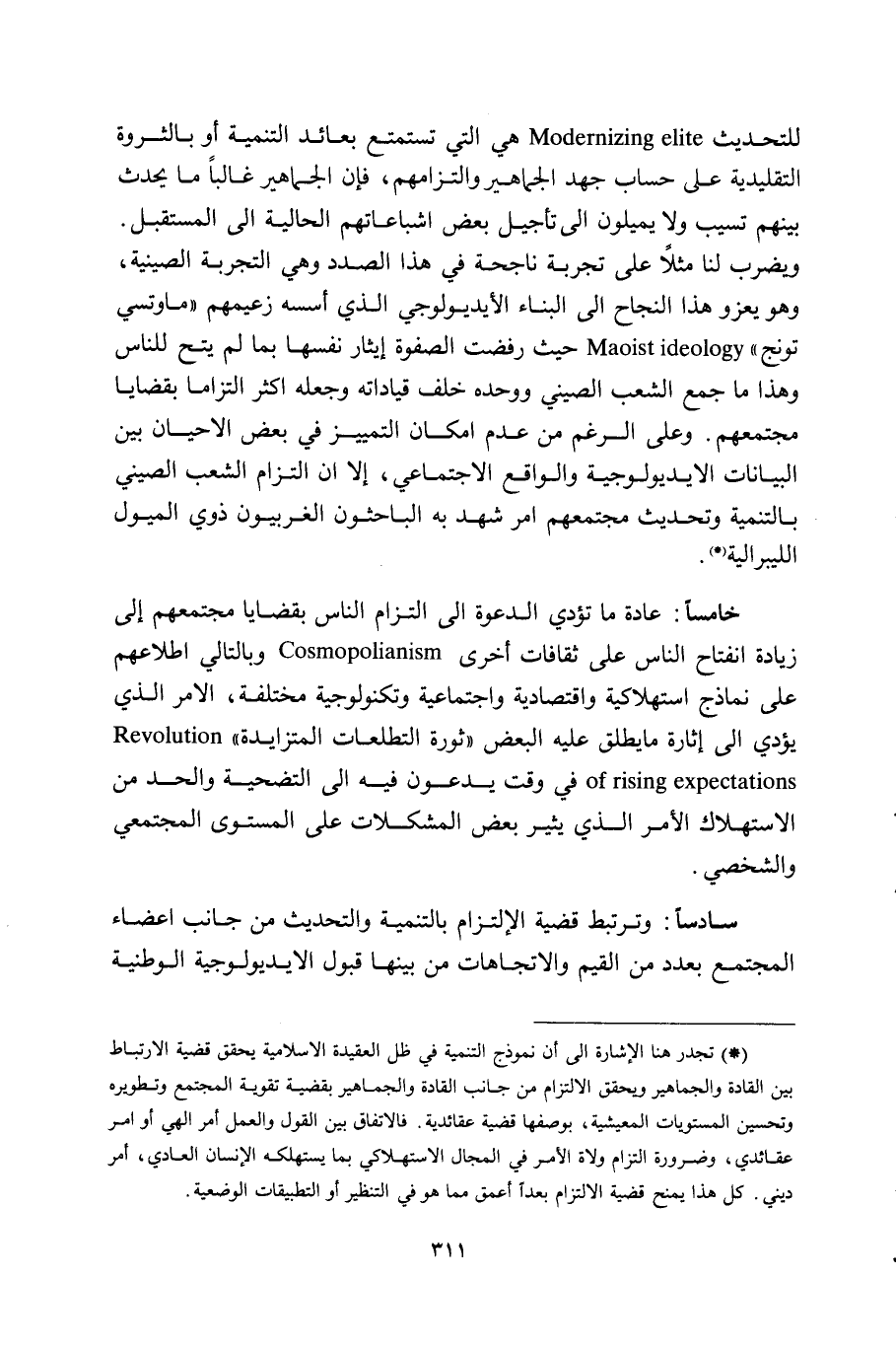* تجدر هنا الإشارة إلى أن نموذج التنمية في ظل العقيدة الإسلامية يحقق قضية الارتباط بين القادة والجماهير ويحقق الالتزام من جانب القادة والجماهير بقضية تقوية المجتمع وتطويره وتحسين المستويات المعيشية، بوصفها قضية عقائدية. فالاتفاق بين القول والعمل أمر إلهي أو أمر عقائدي، وضرورة التزام ولاة الأمر في المجال الاستهلاكي بما يستهلكه الإنسان العادي، أمر ديني. كل هذا يمنح قضية الالتزام بعدًا أعمق مما هو في التنظير أو التطبيقات الوضعية.