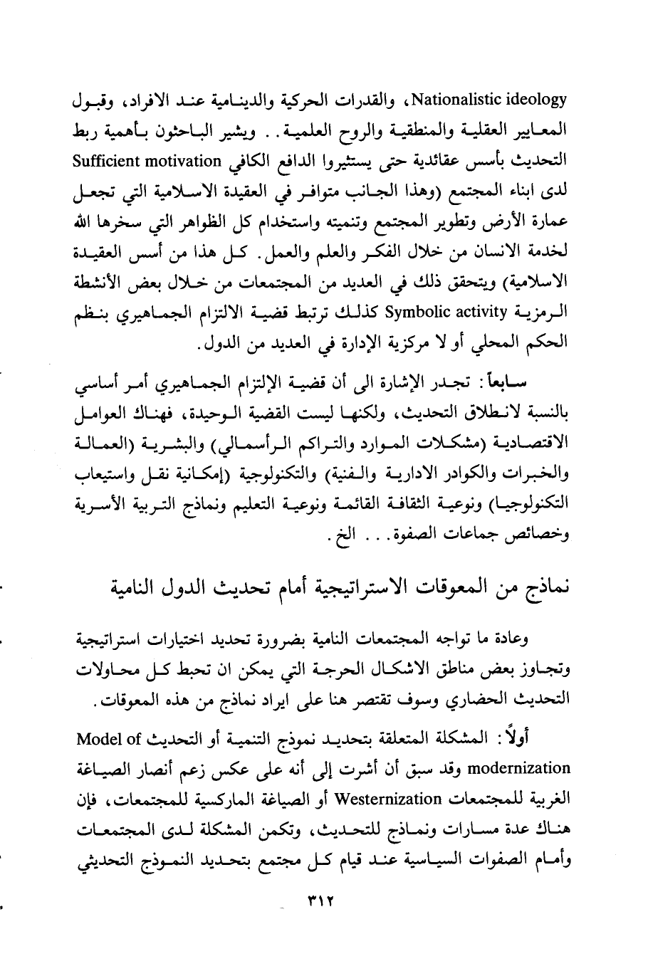 سابعًا: تجدر الإشارة إلى أن قضية الالتزام الجماهيري أمر أساسي بالنسبة لانطلاق التحديث، ولكنها ليست القضية الوحيدة، فهناك العوامل الاقتصادية "مشكلات الموارد والتراكم الرأسمالي" والبشرية "العمالة والخبرات والكوادر الإدارية والفنية" والتكنولوجية "إمكانية نقل واستيعاب التكنولوجيا" ونوعية الثقافة القائمة ونوعية التعليم ونماذج التربية الأسرية وخصائص جماعات الصفوة ... إلخ.